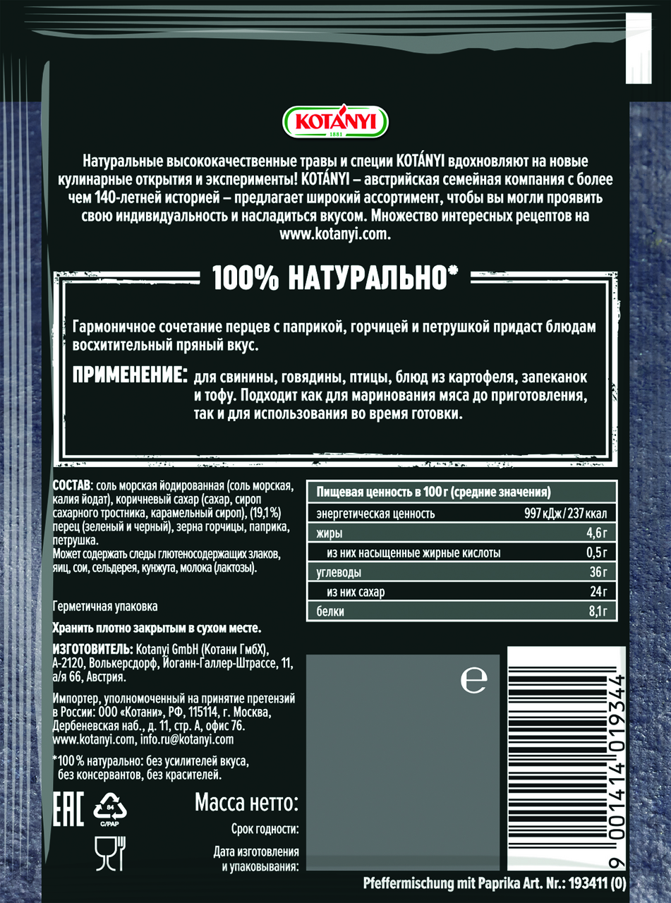 Соль морская йодированная (соль морская, калия йодат), коричневый сахар (сахар, сироп сахарного тростника, карамельный сахарный сироп), (19,1%) перец (зеленый и черный), зерна горчицы, паприка, петрушка.