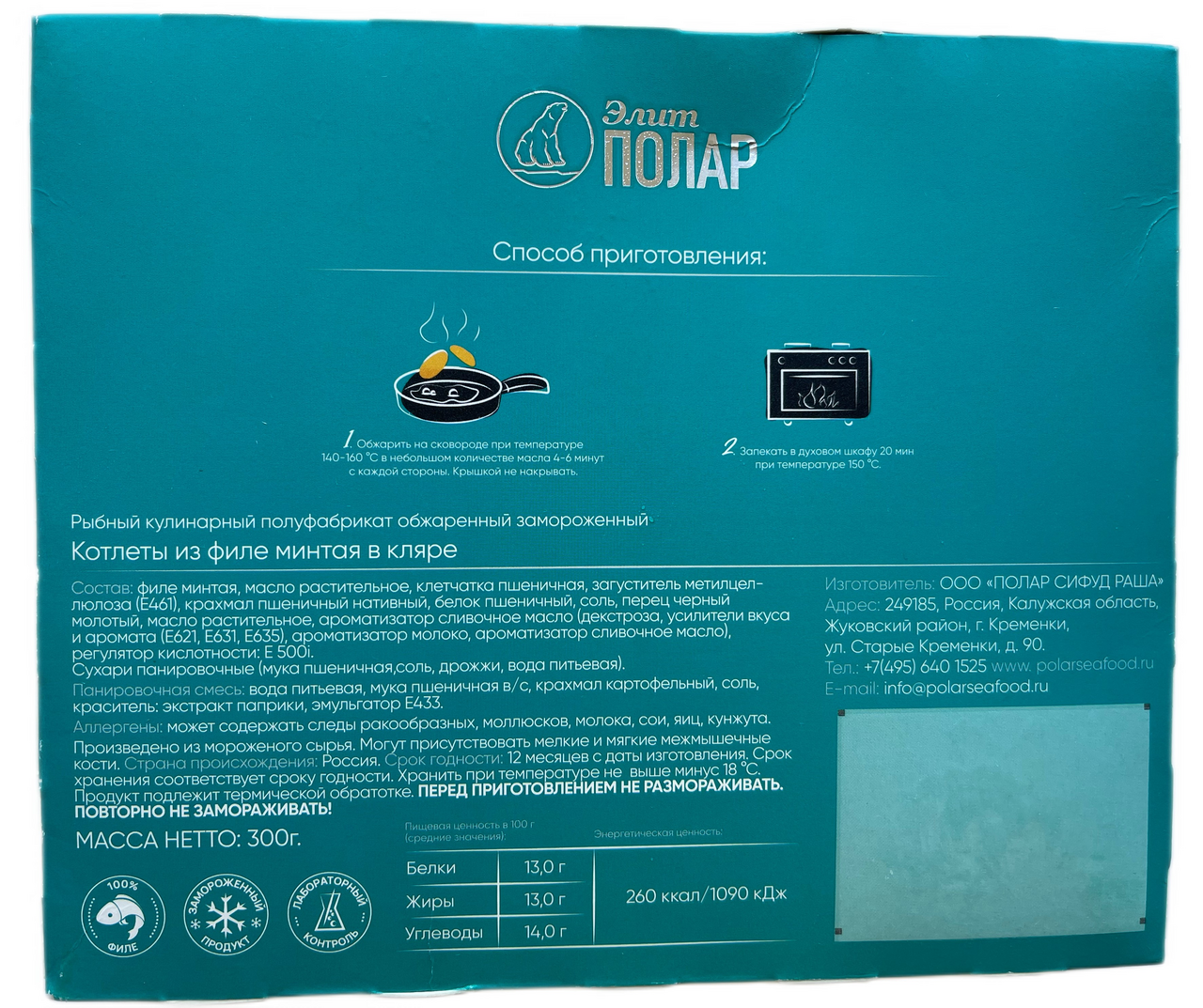Филе минтая, масло растительное, клетчатка пшеничная, загуститель метилцеллюлоза, крахмал пшеничный нативный, белок пшеничный, соль, перец черный молотый, масло растительное, ароматизатор сливочного масла (декстроза, усилители вкуса и аромата (E621, E631, E635), ароматизатор молока, ароматизатор сливочное масло), регулятор кислотности: E 500i. Сухари панировочные (мука пшеничная, соль, дрожжи, вода питьевая). Панировочная смесь (вода питьевая, мука пшеничная в/с, крахмал картофельный, соль, краситель: экстракт паприки, эмульгатор Е433).