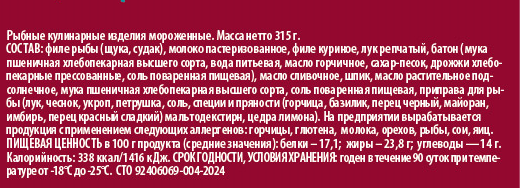 Филе рыбы щука, судак, молоко пастеризованное, филе куриное, лук репчатый, батон (мука пшеничная хлебопекарная высшего сорта, вода питьевая, масло горчичное, сахар-песок, дрожжи хлебопекарные прессованные, соль поваренная пищевая, масло сливочное, шпик, масло растительное подсолнечное, мука пшеничная хлебопекарная высшего сорта, соль поваренная пищевая, приправа для рыбы (лук, чеснок, укроп, петрушка, соль, специи и пряности (горчица, базилик, перец черный, майоран, имбирь, перец красный сладкий) мальтодекстрин, цедра лимона).