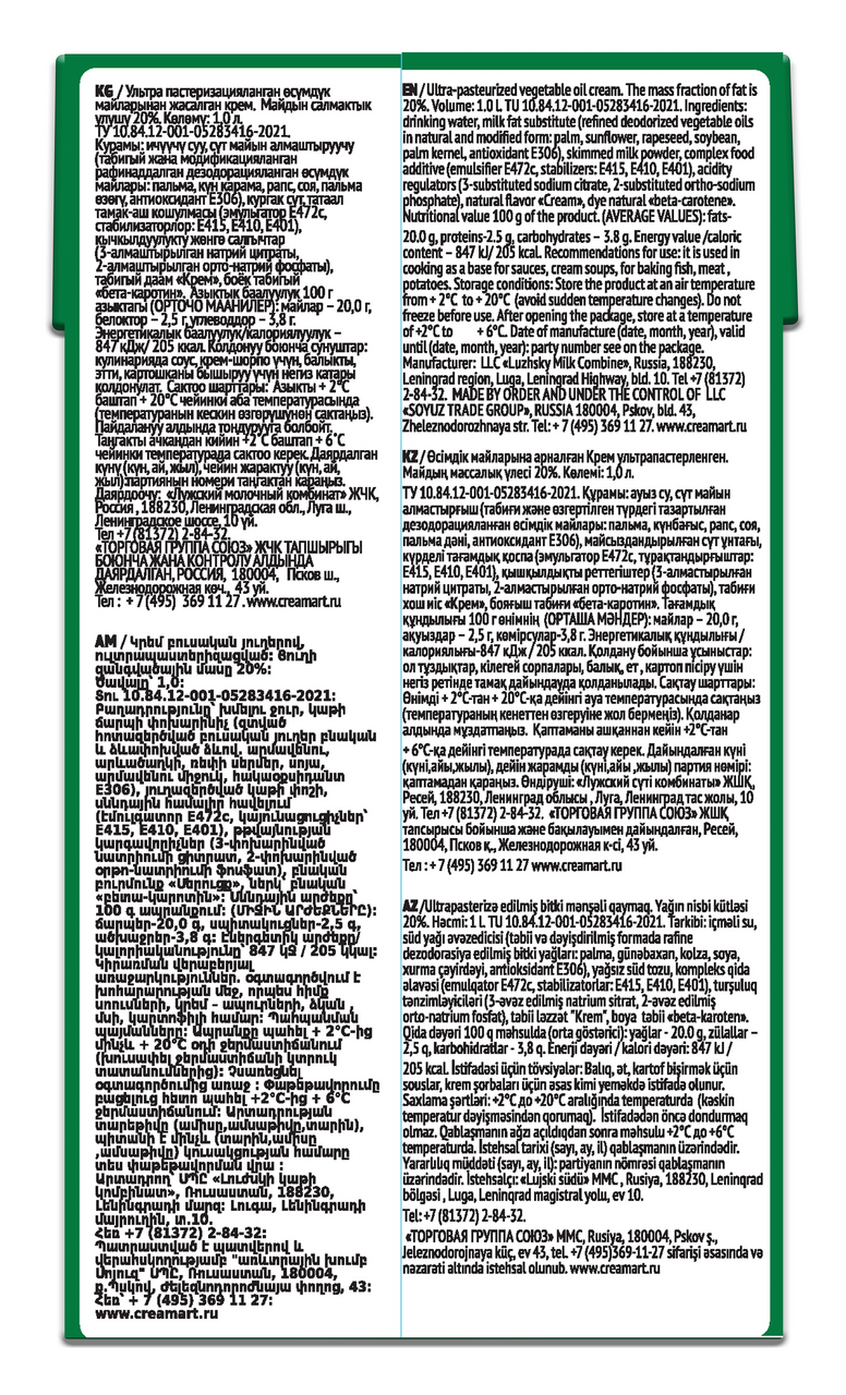Крем Creamart ультрапастеризованный на растительных маслах для соусов 20%, 1л