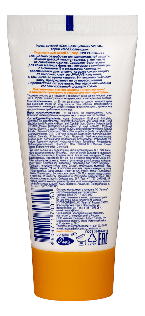 Крем солнцезащитный детский Мое солнышко Водостойкий SPF50+, 55мл