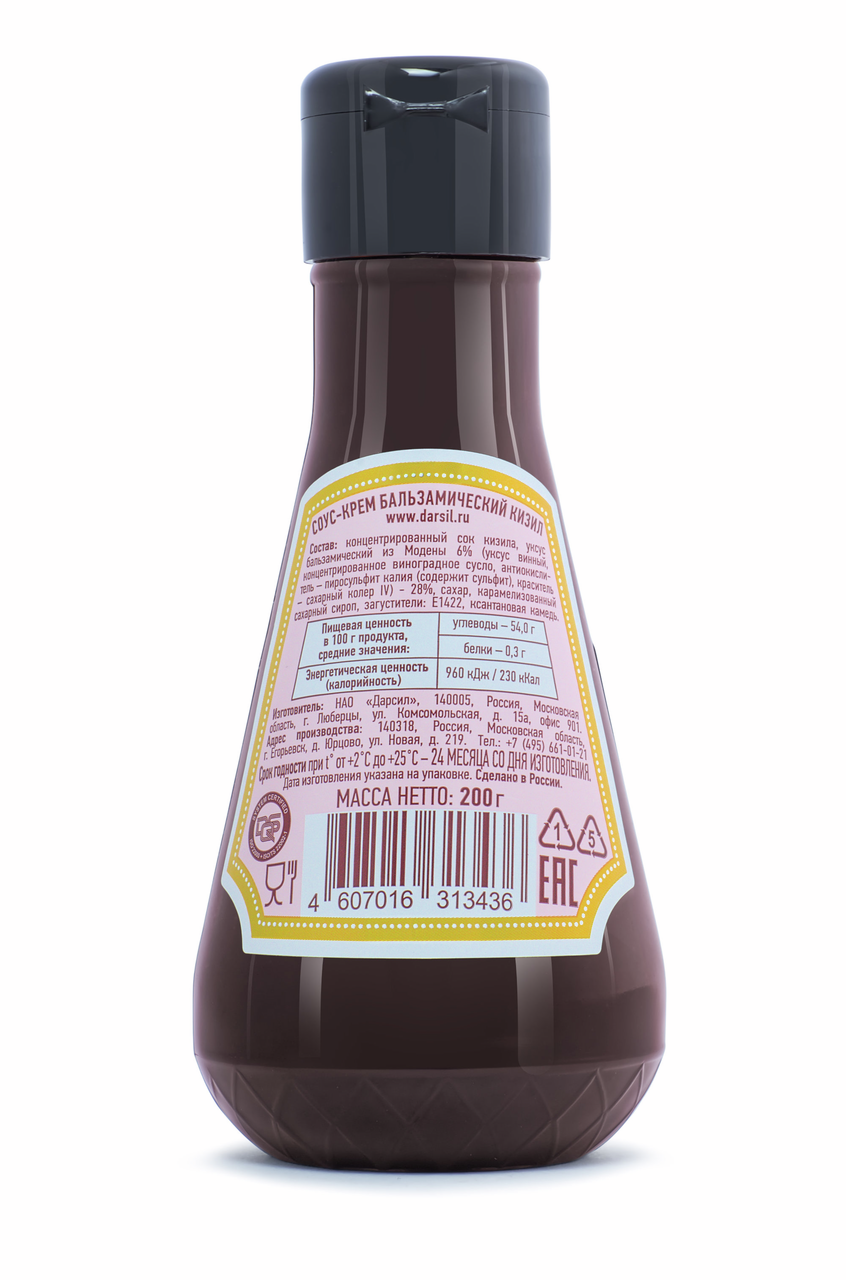 Концентрированный сок кизила, уксус бальзамический из Модены 25% (уксус винный, концентрированное виноградное сусло, антиокислитель пиросульфит калия (содержит сульфит), краситель сахарный колер), сахар, карамелизованный сахарный сироп, загустители (E1422, ксантановая камедь).