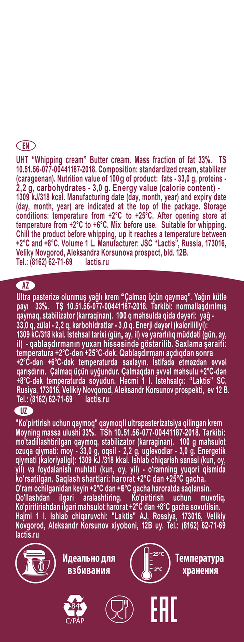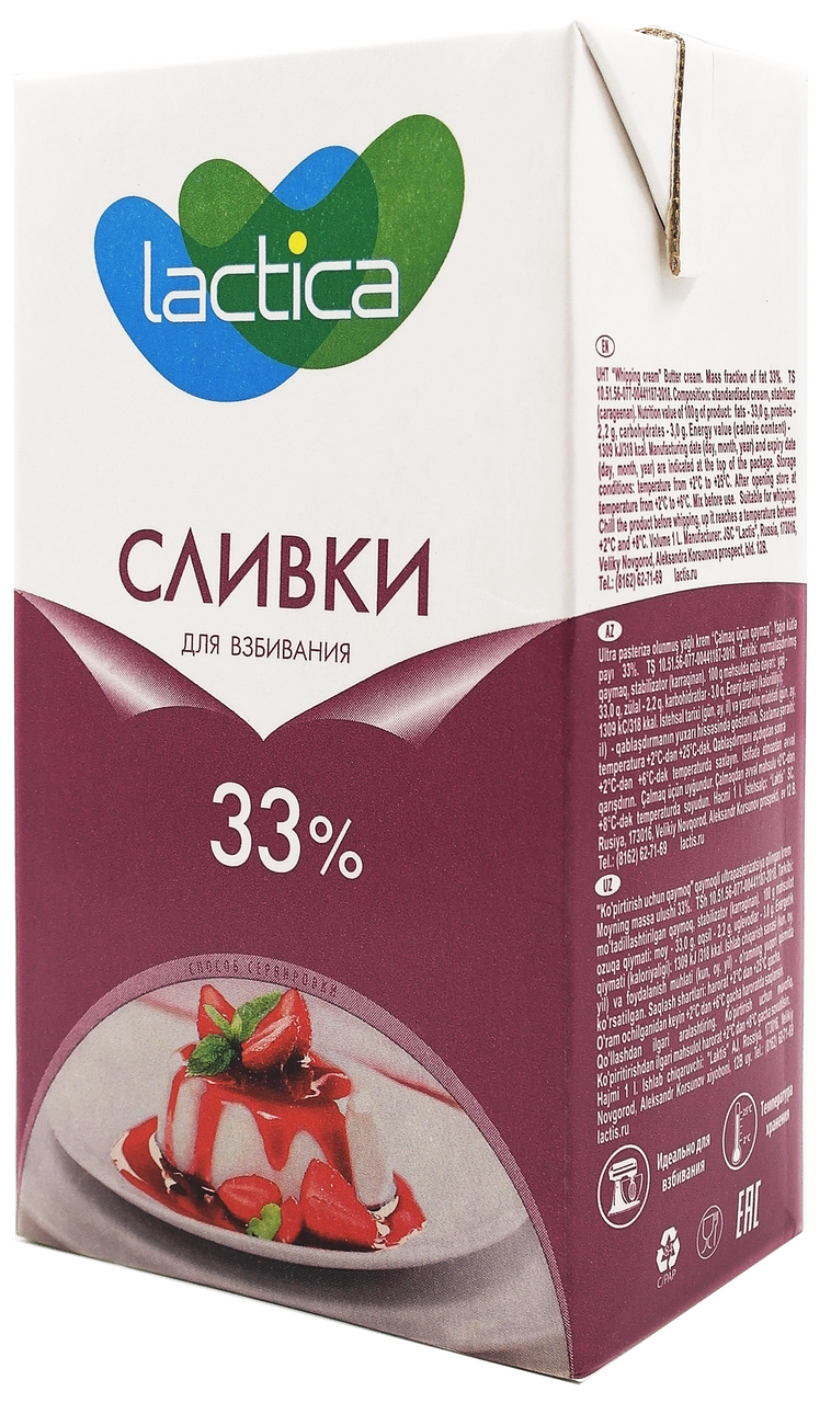 Крем Lactica ультрапастеризованный сливочный для взбивания 33%, 1л