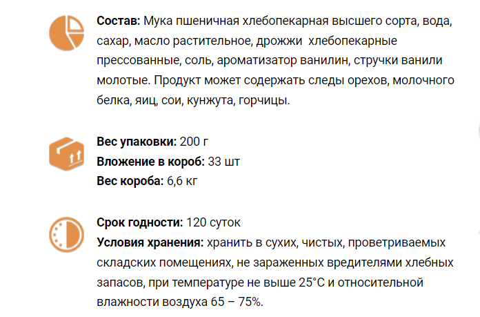Мука пшеничная хлебопекарная высшего сорта, вода, сахар, масло растительное, дрожжи хлебопекарные прессованные, соль, ароматизатор ванилин, стручки ванили молотые. Продукт может содержать следы молочного белка, яиц, сои, кунжута.