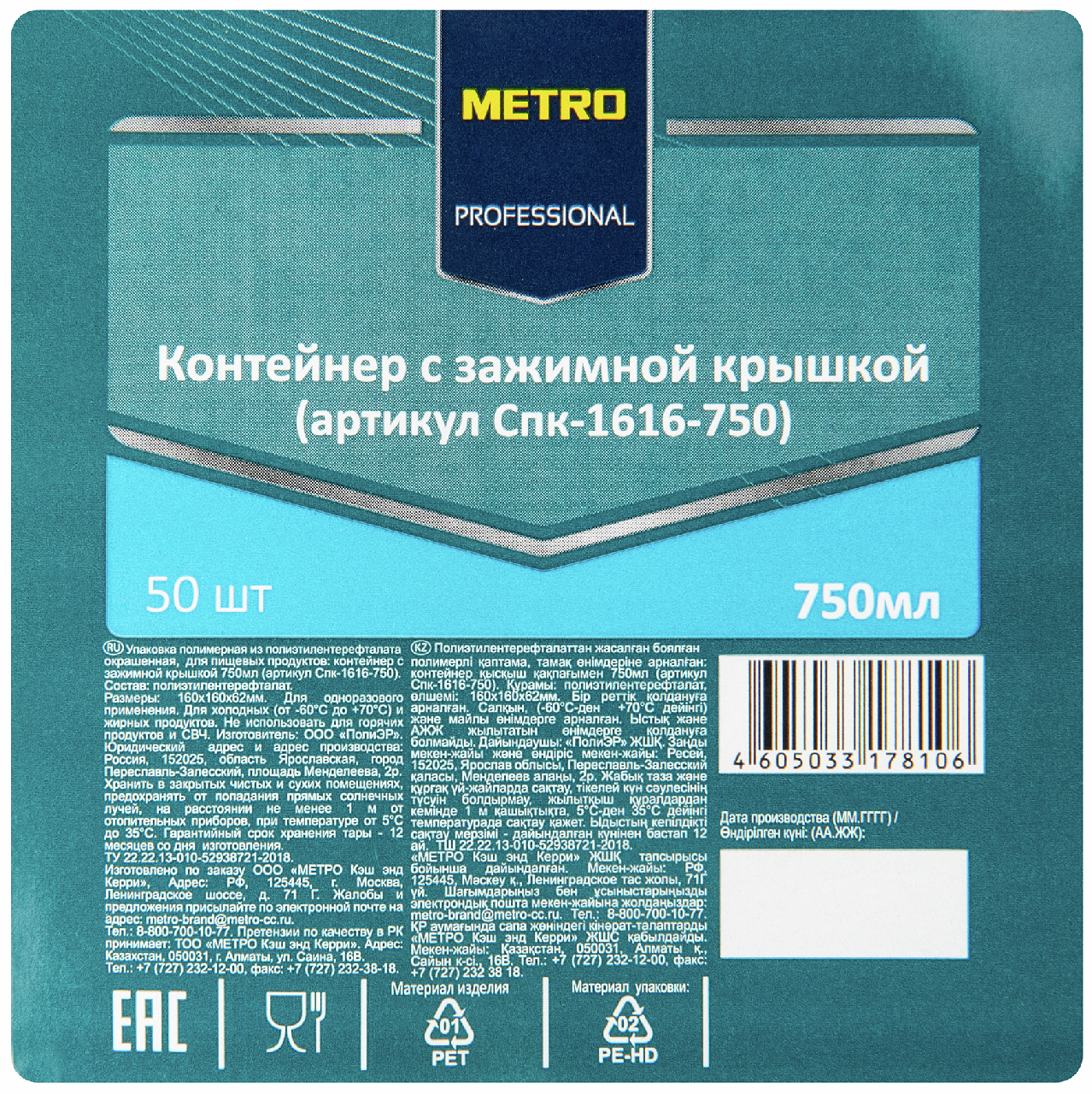 METRO PROFESSIONAL Контейнер + крышка, 750 мл, черный, 50 шт. удобно использовать на автоматических линиях, благодаря возможности запайки. Это особенно полезно для предприятий пищевой промышленности, которые массово производят и упаковывают продукты. Емкость проходит пастеризацию и стерилизацию, что обеспечивает максимальную герметичность упакованной пищи. Прозрачный материал позволяет видеть содержимое контейнера без необходимости его открывать. Это удобно в случае использования нескольких контейнеров одновременно. Емкость прочная и легко моется. Поставляется в комплекте с крышкой. Контейнер подходит для продуктов, которые требуют специальных условий хранения или должны быть сохранены длительный срок. Обеспечивает герметичность, сохраняет свежесть и вкус блюда, исключает протекание и неприятные запахи. Поможет решить проблему надежного хранения и безопасной переноски продуктов. Это изделие экономит место при хранении и транспортировке продуктов. Он удобен и практичен. Незаменимый помощник на кухне и в повседневной жизни. Может использоваться для упаковки еды на вынос, а также для организации питания в офисе или на даче. Он изготовлен из безопасного полипропилена, поэтому подходит для разогрева в СВЧ. Это надежное решение для сохранения свежести и вкуса ваших продуктов. За изделием легко ухаживать.