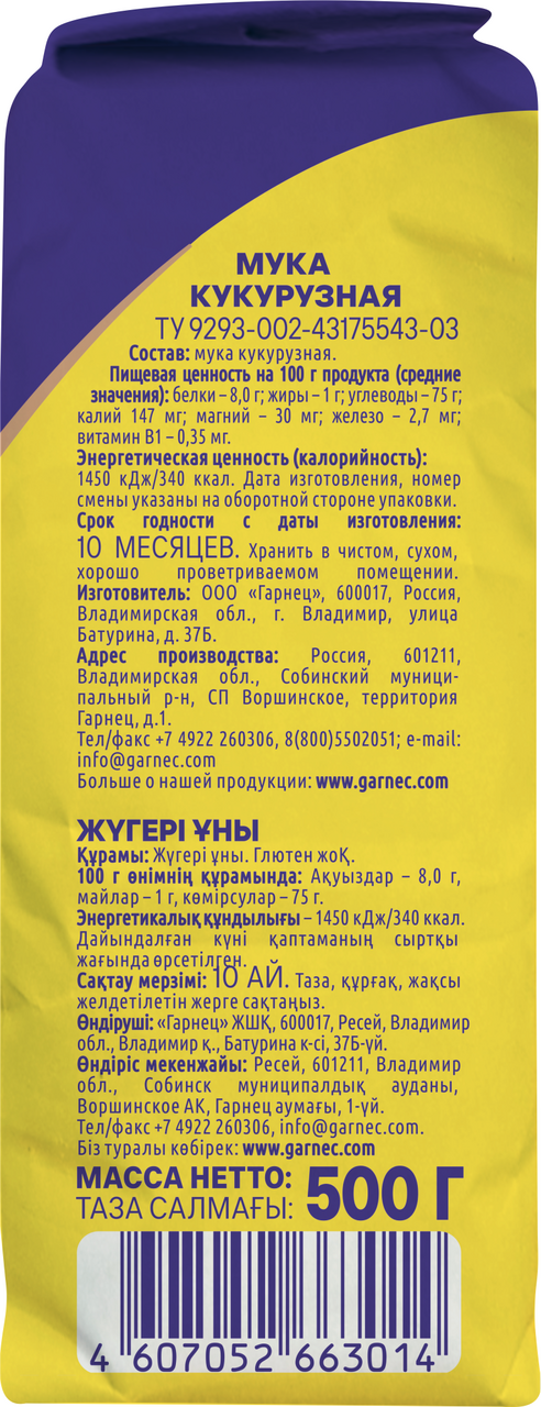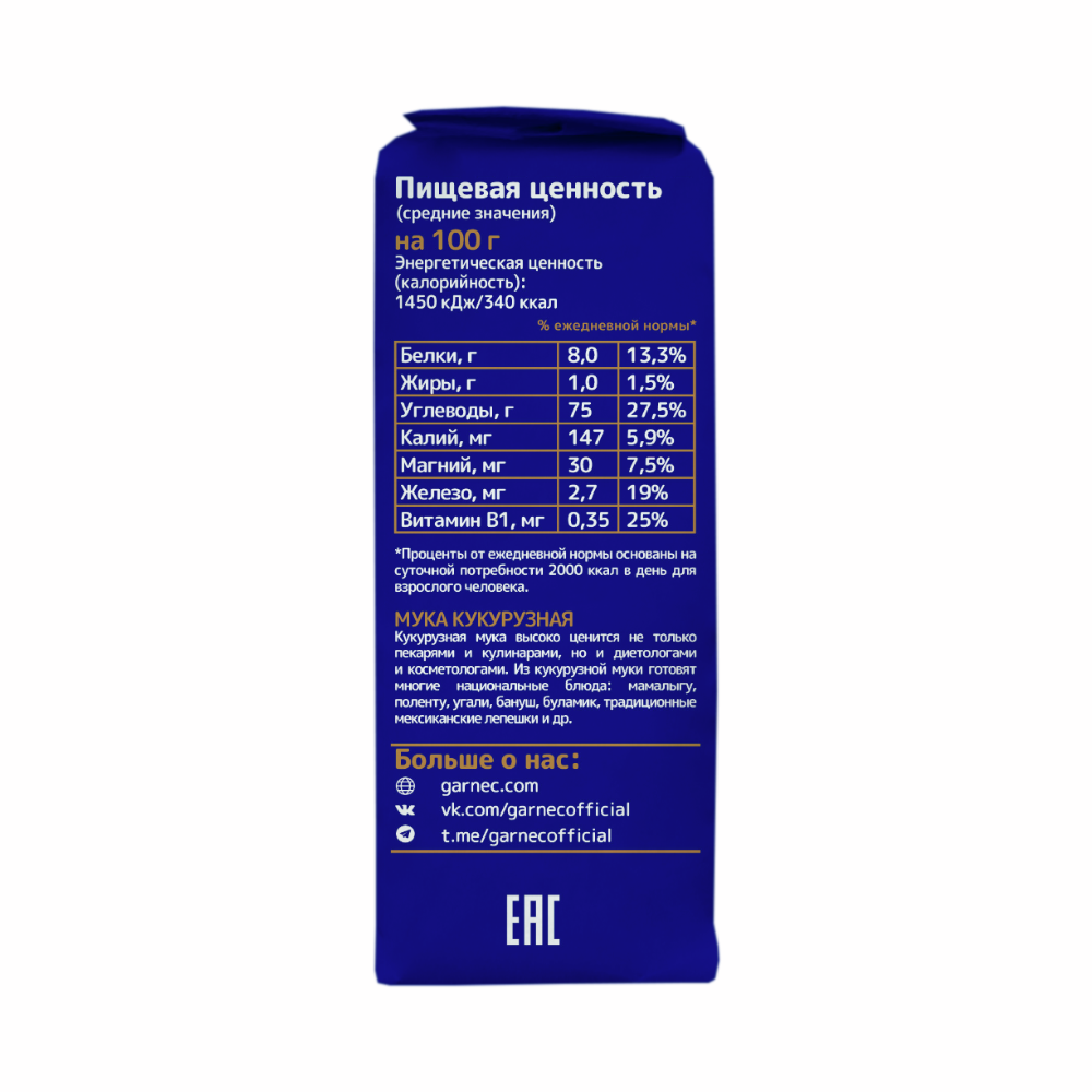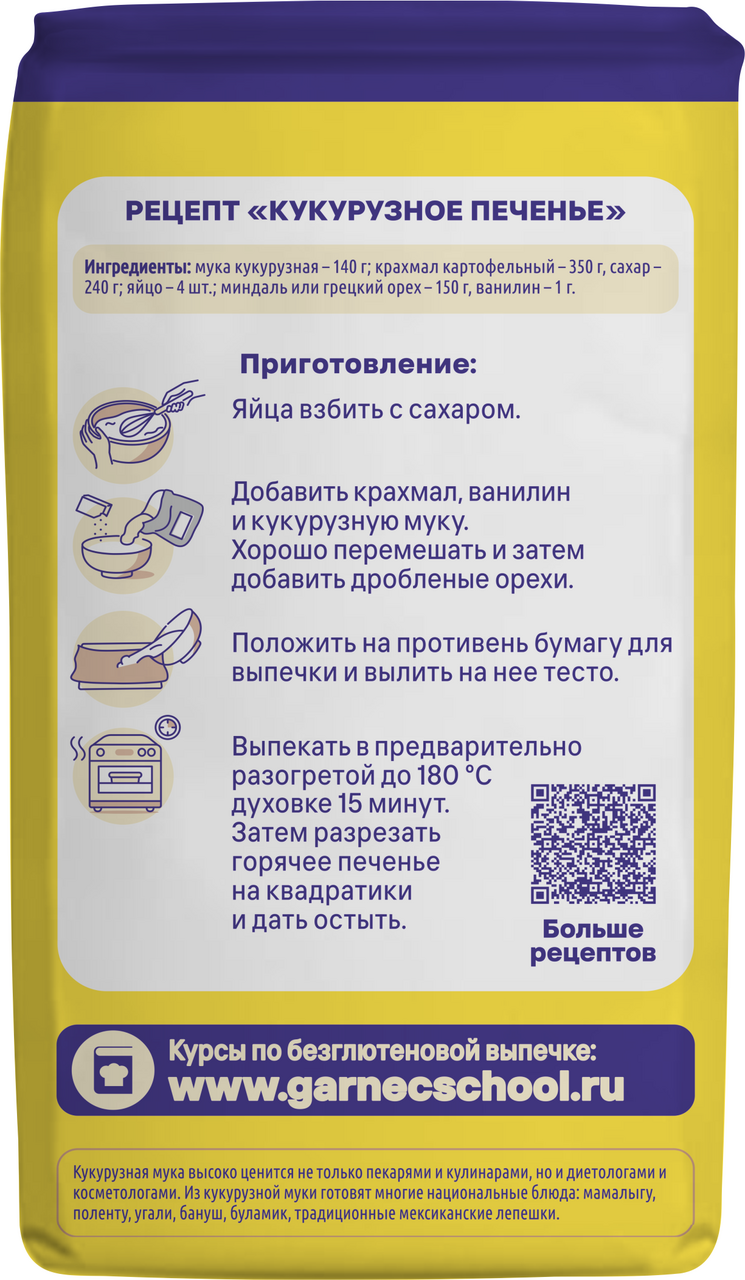 Мука кукурузная Garnec без глютена придает кондитерским изделиям оригинальный вкус и воздушность. Продукт имеет высокую калорийность и сложные углеводы в составе, поэтому быстро утоляет чувство голода, придавая заряд бодрости и сил. Кулинары используют муку из измельченных кукурузных зерен в качестве загустителя для первых блюд, подливок и соусов. Сырье универсальное, так как из него можно приготовить печенье, пироги, оладьи и пресные лепешки. Продукт характеризуется высоким содержанием клетчатки, благодаря чему популярен среди людей, поддерживающих здоровый образ жизни или диету.