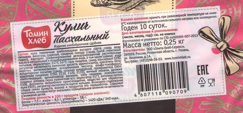 Кулич Томин хлеб Пасхальный, 250г– традиционное пасхальное угощение, приготовленное по классической рецептуре на основе пшеничной хлебопекарной муки высшего сорта с добавлением натурального творога, большого количества изюма, сахарного песка, яичного меланжа и прочих компонентов. Кулич среднего размера, декорированный белой глазурью и разноцветной посыпкой, станет достойным украшением праздничного стола, создаст атмосферу уюта и тепла, поднимет настроение. А главное, чтобы побаловать себя и близких вкуснейшей пасхальной выпечкой, вам не придется искать рецепты, подбирать ингредиенты и проводить много времени на кухне. Просто откройте красочно оформленную коробочку, достаньте готовый кулич, поставьте его в центр тарелочки и разложите вокруг крашеные яйца. Такая подача непременно привлечет внимание ваших домочадцев и сделает праздник Пасхи еще более ярким и запоминающимся!