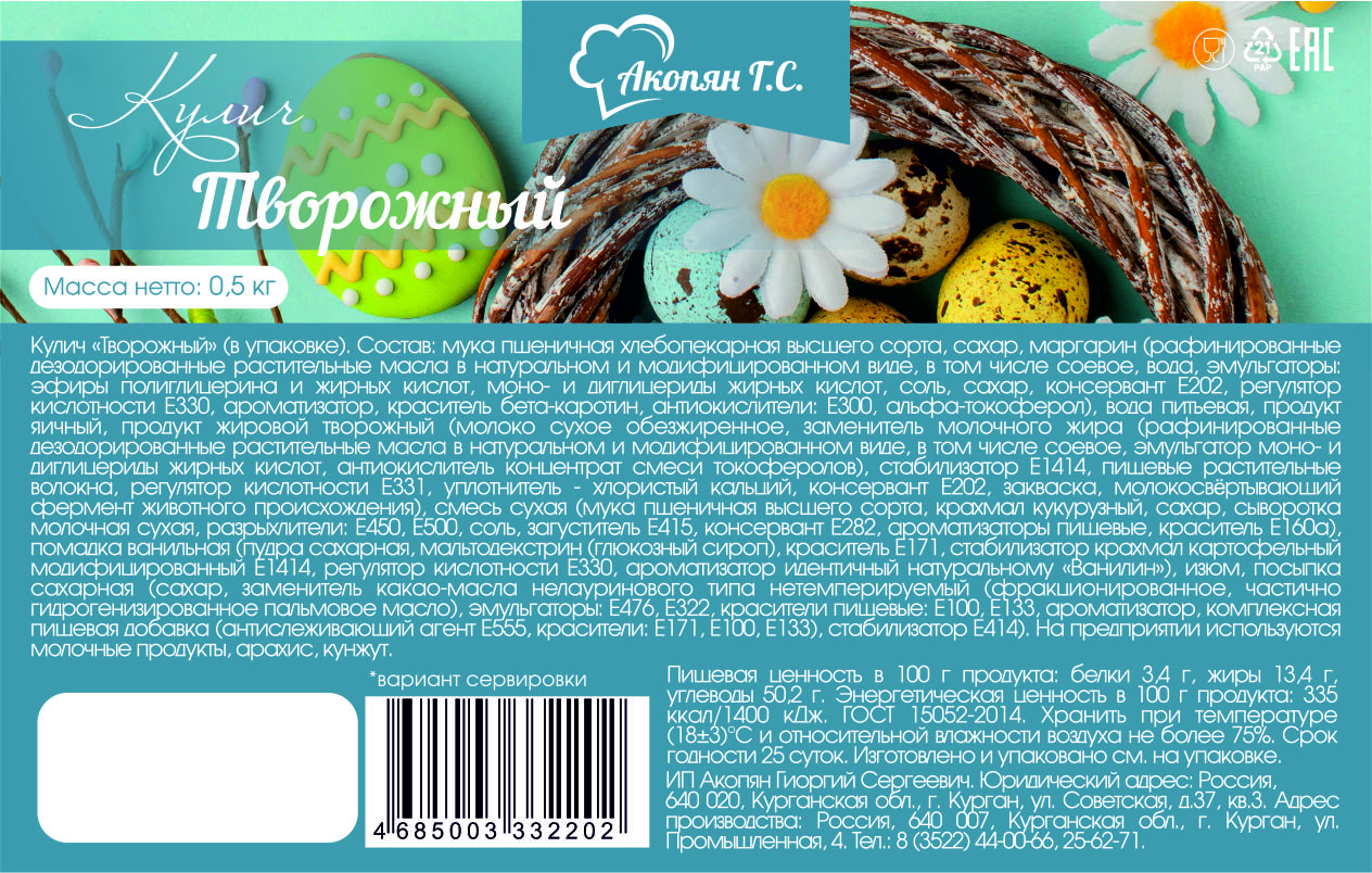 Мука пшеничная хлебопекарная высшего сорта, сахар, маргарин (рафинированные дезодорированные растительные масла в натуральном и модифицированном виде, в том числе соевое, вода, эмульгаторы: эфиры полиглицерина и жирных кислот, моно- и диглицериды жирных кислот, соль, сахар, консервант E202, регулятор кислотности E330, ароматизатор, краситель бета-каротин, антиокислители: E300, альфа-токоферол), вода питьевая, продукт яичный, продукт жировой творожный (молоко сухое обезжиренное, заменитель молочного жира (рафинированные дезодорированные растительные масла в натуральном и модифицированном виде, в том числе соевое, эмульгатор моно- и диглицериды жирных кислот, антиокислитель концентрат смеси токоферолов), стабилизатор E1414, пищевые растительные волокна, регулятор кислотности E331, уплотнитель - хлористый кальций, консервант E202, закваска, молокосвертывающий фермент животного происхождения), смесь сухая (мука пшеничная высшего сорта, крахмал кукурузный, сахар, сыворотка молочная сухая, разрыхлители: E450, E500, соль, загуститель E415, консервант E282, ароматизаторы пищевые, краситель E160а), помадка ванильная (пудра сахарная, мальтодекстрин (глюкозный сироп), краситель E171, стабилизатор крахмал картофельный модифицированный E1414, регулятор кислотности E330, ароматизатор идентичный натуральному Ванилин), изюм, посыпка сахарная (сахар, заменитель какаю-масла нелауринового типа нетемперируемый (фракционированное, частично гидрогенизированное пальмовое масло), эмульгаторы: E476, E322, красители пищевые: E100, E133, ароматизатор, комплексная пищевая добавка (антислеживающий агент E555, красители: E171, E100, E133), стабилизатор E414).