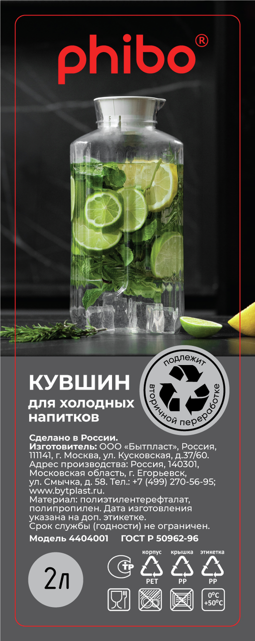 Лаконичный дизайн универсальных кувшинов Phibo из коллекции Trend с имитацией стеклянной поверхности отвечает всем современным тенденциям домашнего обустройства. Удобные по форме, они легко помещаются в боковой дверце холодильника, имеют плотно прилегающую крышку и удобный носик. Кувшины прекрасно подходят для различных напитков: воды, соков, молока, морсов, компотов или домашних лимонадов. Легкие и прочные кувшины не разобьются от неловкого движения. Даже полностью наполненные кувшины удобно держать одной рукой. Кувшины подходят как для ежедневного использования, так и для праздничных мероприятий. Крышка имеет два режима: открыто и закрыто для защиты напитков от пыли и посторонних запахов. Температурный режим использования наполненного жидкостью кувшина: от 0С до +50С. Кувшины производятся из высококачественного пищевого российского сырья и подлежат вторичной переработке.