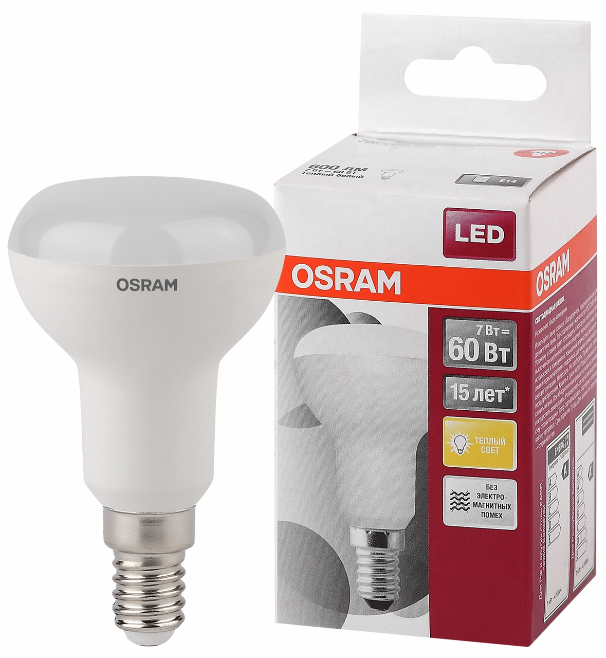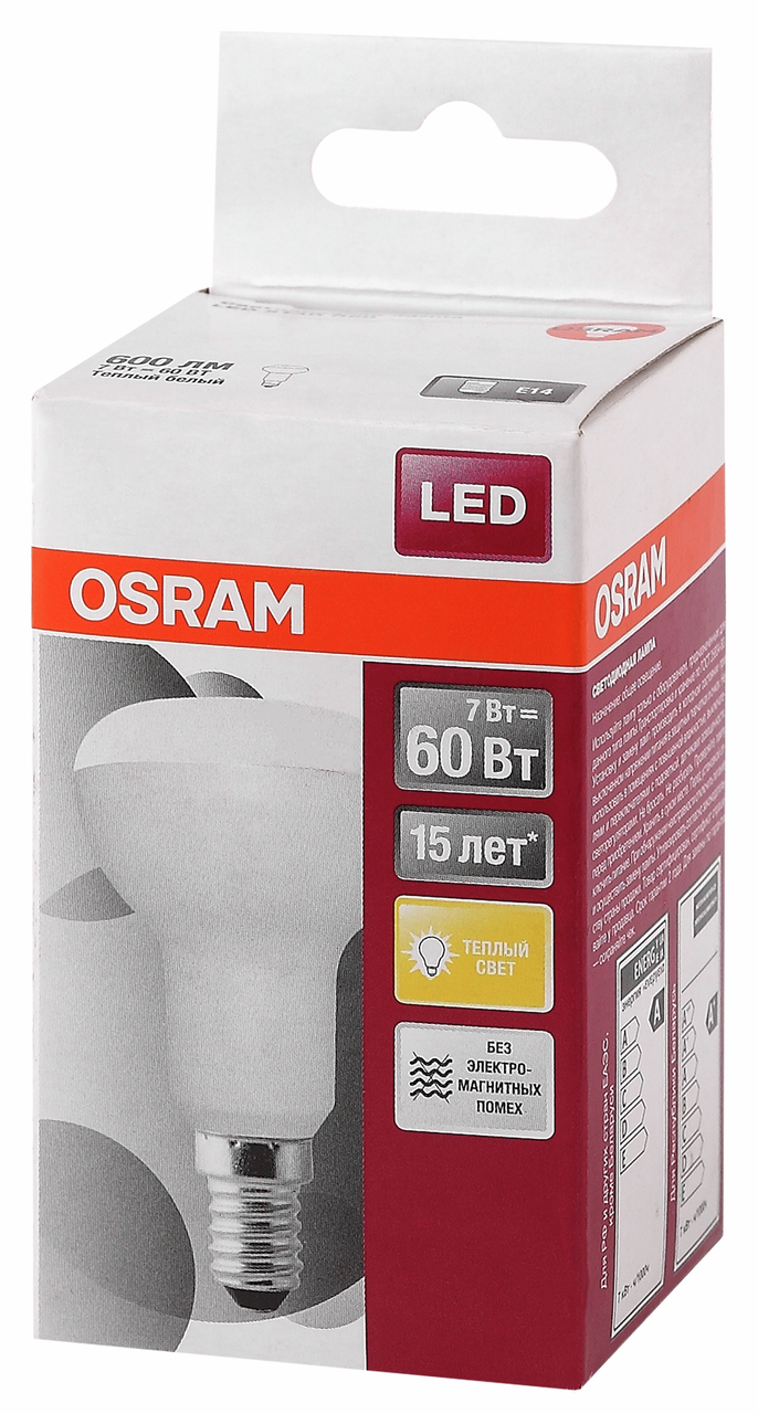 Лампа светодиодная OSRAM LED Star R, 600лм, 7Вт (замена 60Вт), 3000К (теплый белый свет). Цоколь E14, колба R, угол пучка 120. Исполнение колбы матовое, пластик. Напряжение питания 220-240В. Товар сертифицирован.