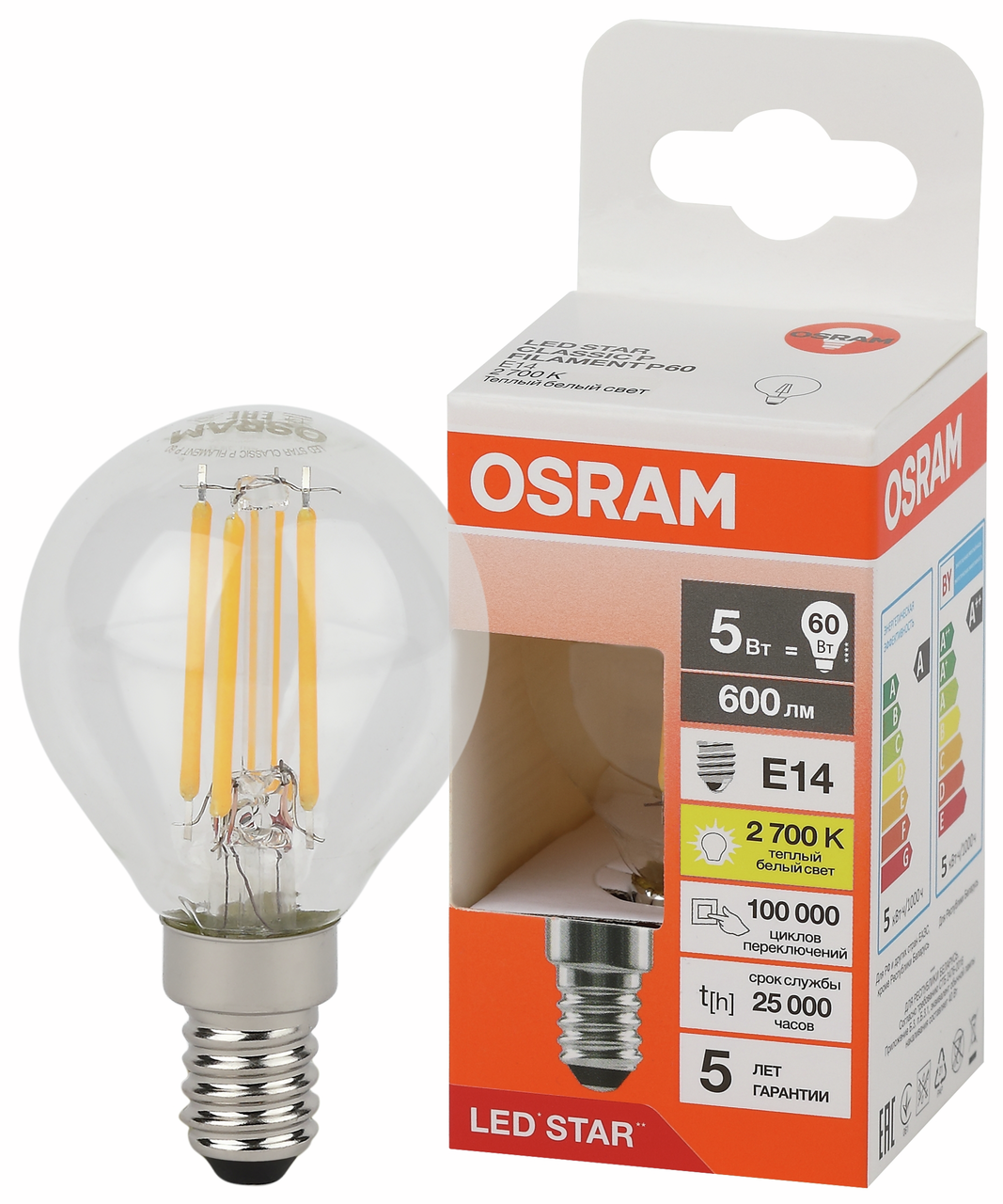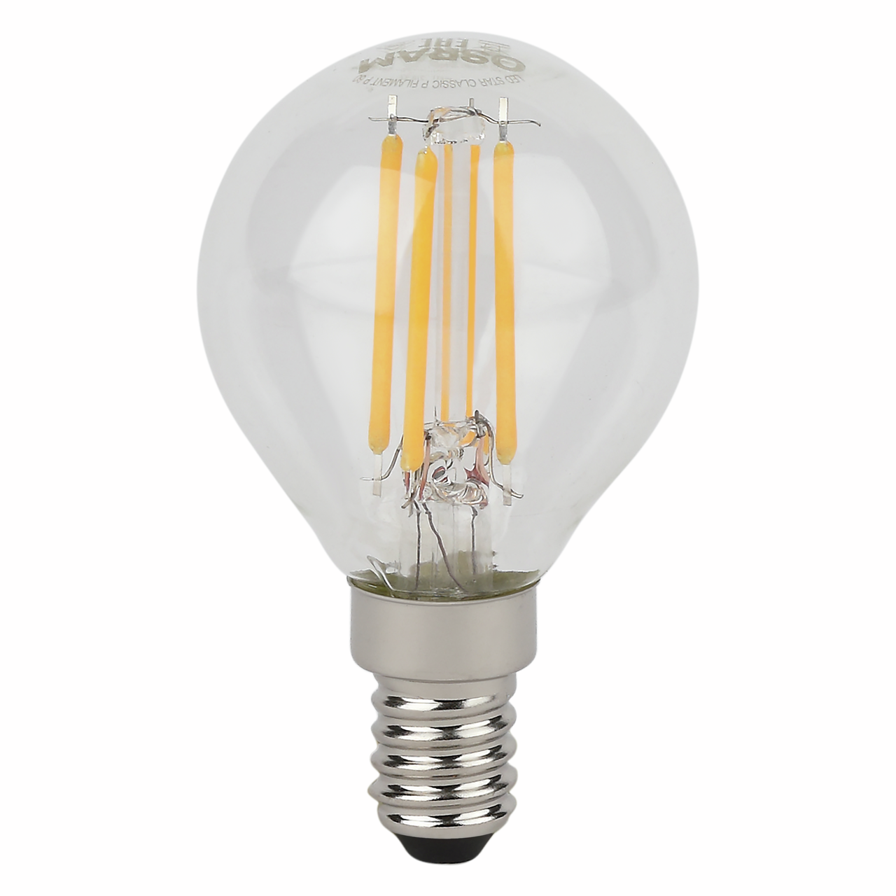 Лампа светодиодная филаментная OSRAM LED Star, 600лм, 5Вт (замена 60Вт), 2700К (теплый белый свет). Цоколь E14, колба P, угол пучка 300. Исполнение колбы прозрачное, стекло. Напряжение питания 220-240В. Особенности: гарантия 5 лет. Товар сертифицирован.