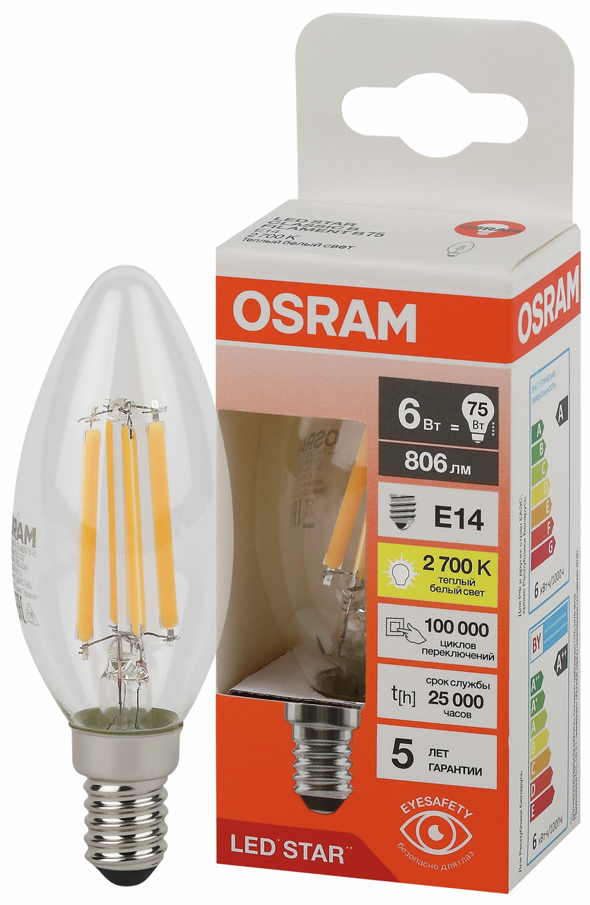Лампа светодиодная филаментная OSRAM LED Star, 806лм, 6Вт (замена 75Вт), 2700К (теплый белый свет). Цоколь E14, колба B, угол пучка 300. Исполнение колбы прозрачное, стекло. Напряжение питания 220-240В. Особенности: гарантия 5 лет. Товар сертифицирован.