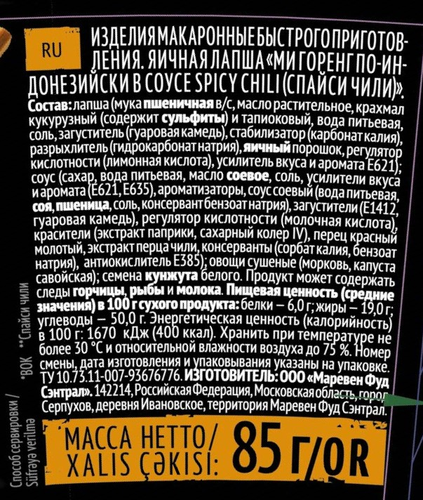 Лапша мука пшеничная, масло растительное, крахмал кукурузный содержит сульфиты и тапиоковый, вода питьевая, соль, загуститель гуаровая камедь, стабилизатор карбонат калия, разрыхлитель гидрокарбонат натрия, яичный порошок, регулятор кислотности лимонная кислота, усилитель вкуса и аромата Е621; соус сахар, вода питьевая, масло соевое, соль, усилители вкуса и аромата Е621, Е635, ароматизаторы, соус соевый вода питьевая, соя, пшеница, соль, консервант бензоат натрия, загустители Е1412, гуаровая камедь, регулятор кислотности молочная кислота, красители экстракт паприки, сахарный колер IV, перец красный молотый, экстракт перца чили, консерванты сорбат калия, бензоат натрия, антиокислитель Е385; овощи сушёные морковь, капуста савойская; семена кунжута белого.