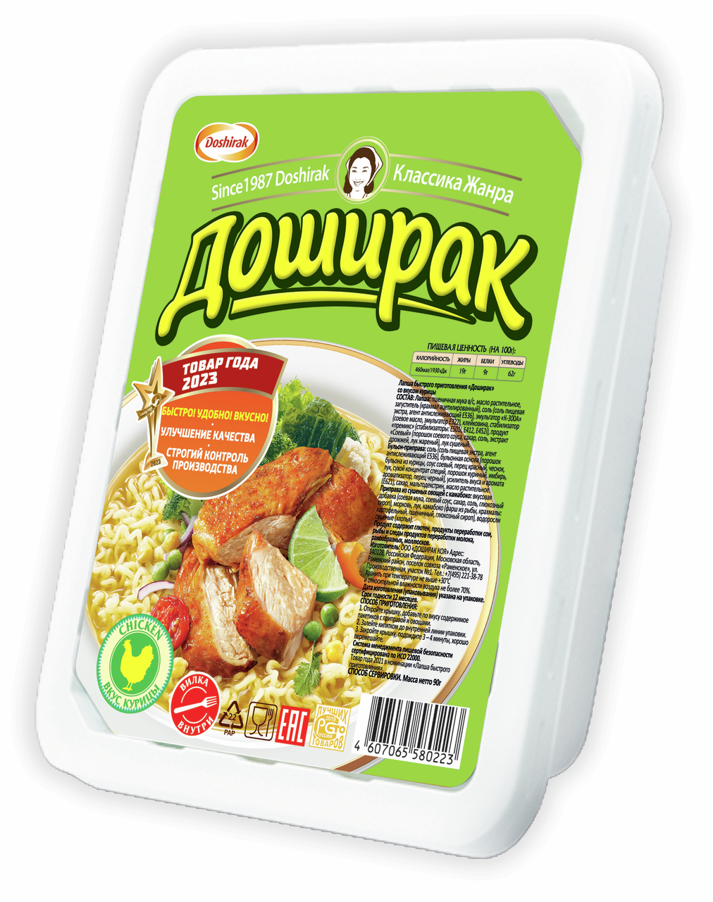 Доширак со вкусом курицы – лапша быстрого приготовления, обогащенная йодом. В приправе из сушеных овощей содержится ламинария, богатая полезными для здоровья минералами и витаминами, благодаря которым нормализуется работа щитовидной железы, улучшаются обменные процессы в организме, нормализуется работа сердечно-сосудистой системы, восстанавливается витаминный баланс, снижается уровень холестерина, выводятся радионуклиды и токсины, укрепляется иммунитет.