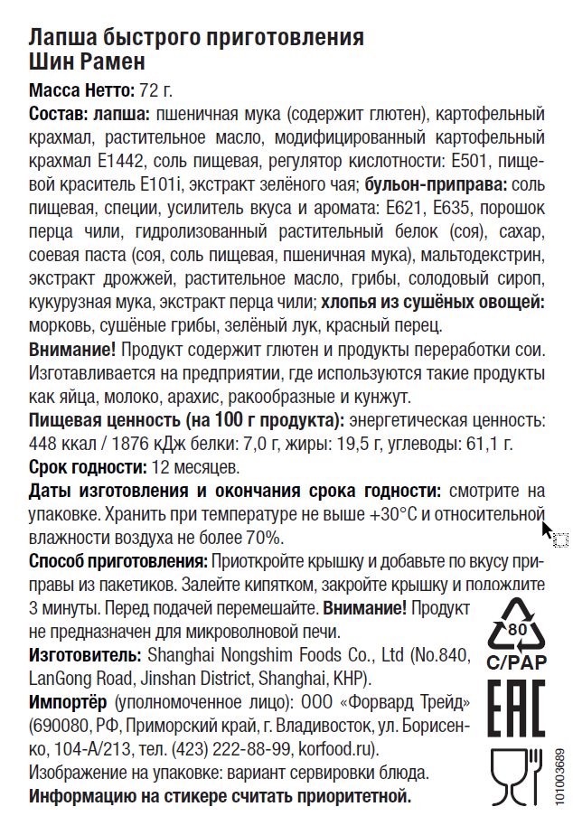 Лапша: пшеничная мука (содержит глютен), картофельный крахмал, растительное масло, модифицированный картофельный крахмал E1442, соль пищевая, регулятор кислотности: E501, пищевой краситель Е101i, экстракт зелёного чая; бульон-приправа: соль пищевая, специи, усилитель вкуса и аромата: E621, E635, порошок перца чили, гидролизованный растительный белок (соя), сахар, соевая паста (соя, соль пищевая, пшеничная мука), мальтодекстрин, экстракт дрожжей, растительное масло, грибы, овощной сироп, кукурузная мука, экстракт перца чили; хлопья из сушёных овощей: морковь, сушёные грибы, зелёный лук, красный перец.
