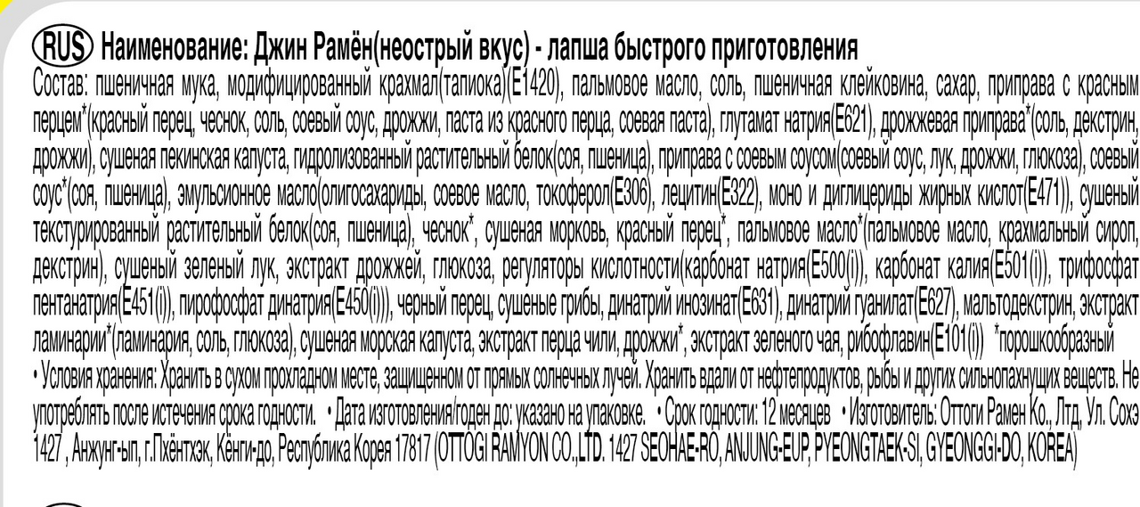 Пшеничная мука, модифицированный тапиоковый крахмал Е1420, пальмовое масло, соль пищевая, картофельный крахмал, сахар, пшеничная клейковина, приправа с красным перцем (красный перец, чеснок, соль пищевая, соевый соус (соя, пшеница), дрожжи, паста из красного перца, соевая паста), усилитель вкуса и аромата Е621, приправа (соль пищевая, декстрин, дрожжи), сушёная пекинская капуста, гидролизованный растительный белок (соя, пшеница), приправа с соевым соусом (соевый соус (соя, пшеница), лук, дрожжи, глюкоза), соевый соус (соя, пшеница), текстурированный растительный белок (соя, пшеница), чеснок, сушёная морковь, красный перец, пальмовое масло, крахмальный сироп, декстрин, сушёный зелёный лук, дрожжи, глюкоза, регуляторы кислотности: Е500, Е501, Е451, эмульгатор Е540, чёрный перец, сушёные грибы, усилители вкуса и аромата: Е631, Е627, мальтодекстрин, экстракт ламинарии (ламинария, соль пищевая, глюкоза), сушёная морская капуста, экстракт перца чили, дрожжи, экстракт зелёного чая, пищевой краситель Е101.