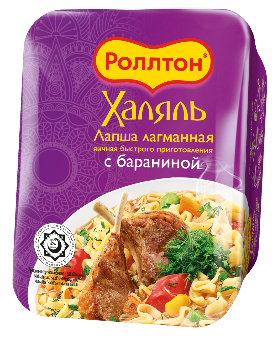 Лапша Роллтон Халяль лагманная с бараниной - лапша имеет вкус лагмана - традиционного среднеазиатского блюда, которое обычно готовится с мясом, овощами и специями. Лапша заливается кипятком и настаивается несколько минут, после чего добавляется приправа.