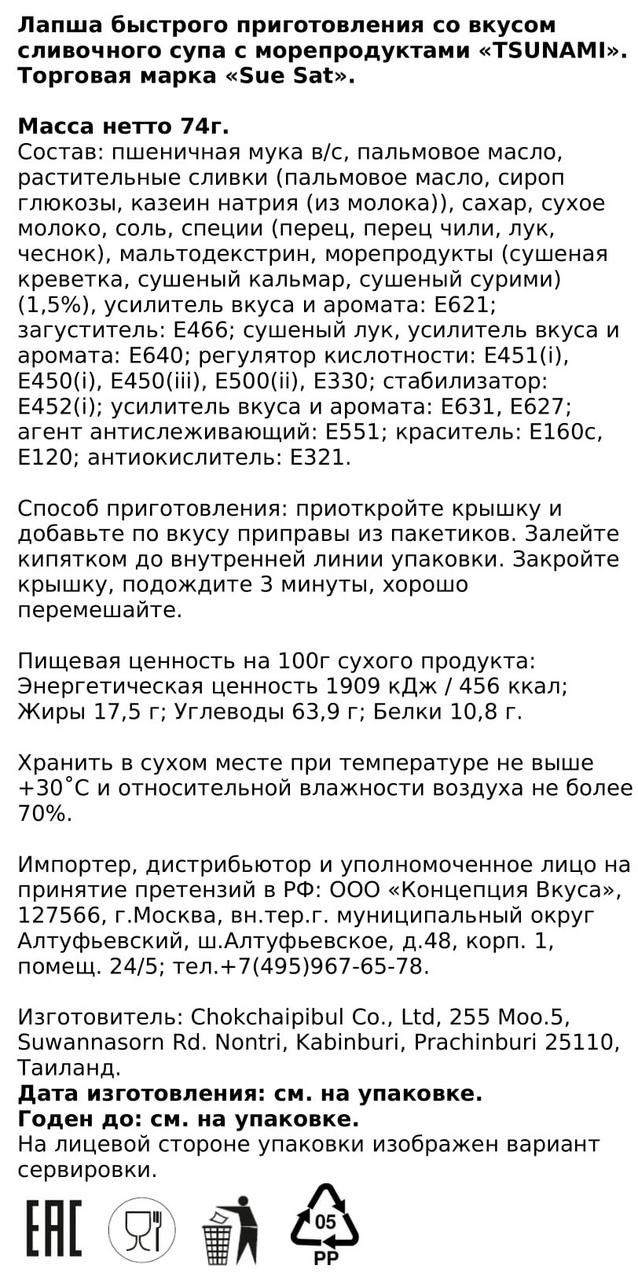 Традиционная тайская кухня. Окунись в мир традиционного тайского вкуса, пикантных специй и незабываемых ароматов с лапшой быстрого приготовления Sue Sat. Нежный сливочный суп с морепродуктами перенесёт вас на берега Сиама всего за 5 минут. Роскошный букет ароматов: сочные креветки, тайские специи и нежные сливочные ноты. Подарите себе гастрономическое путешествие, не выходя из дома. Откройте для себя настоящую Азию прямо сейчас.