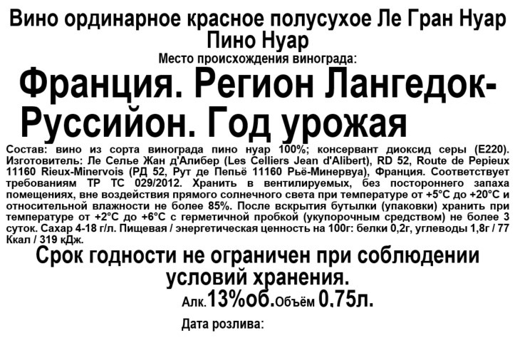 Вино Les Celliers Jean D'alibert Le Grand Noir Pinot Noir красное полусухое, 0.75л крепостью 12,5% отличается насыщенным красно-рубиновым оттенком. Оно дарит мягкий, округлый и сбалансированный вкус с нотами фруктов. . Аромат раскрывается оттенками вишни, смородины, синих цветов и пряностей. Напиток из ягод сортов пино нуар и гренаш созревает в дубовых бочках французской и американской древесины. Он входит в линейку вин, названных в честь священников, живших на территории нынешних виноградников и носивших только черное. Эти вина отлично передают нюансы здешнего терруара. Алкоголь отлично подойдет к зрелым сырам, мясу на гриле, жареному мясу. Чтобы он полностью раскрыл свой букет вкуса и аромата, его рекомендуется подавать к столу охлажденным до 16-18 градусов. Потенциальный срок хранения бутылки — 2-4 года. Лучше всего разместить бутылку горизонтально в темном прохладном месте с относительной влажностью воздуха 65-80 %. Les Celliers Jean dAlibert — компания, основанная в 1978 году. Она располагает современным винным производством и контролирует изготовление напитков на всех этапах.