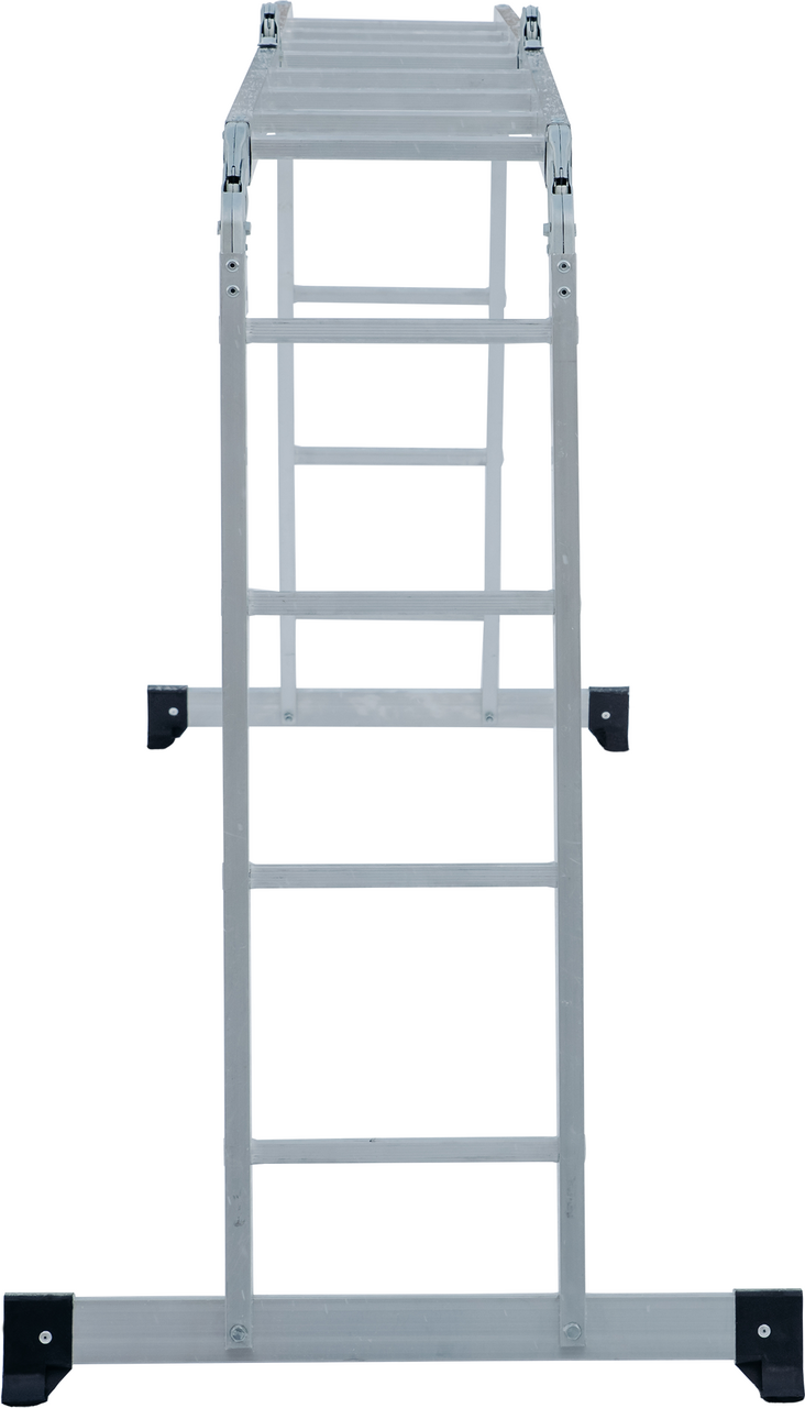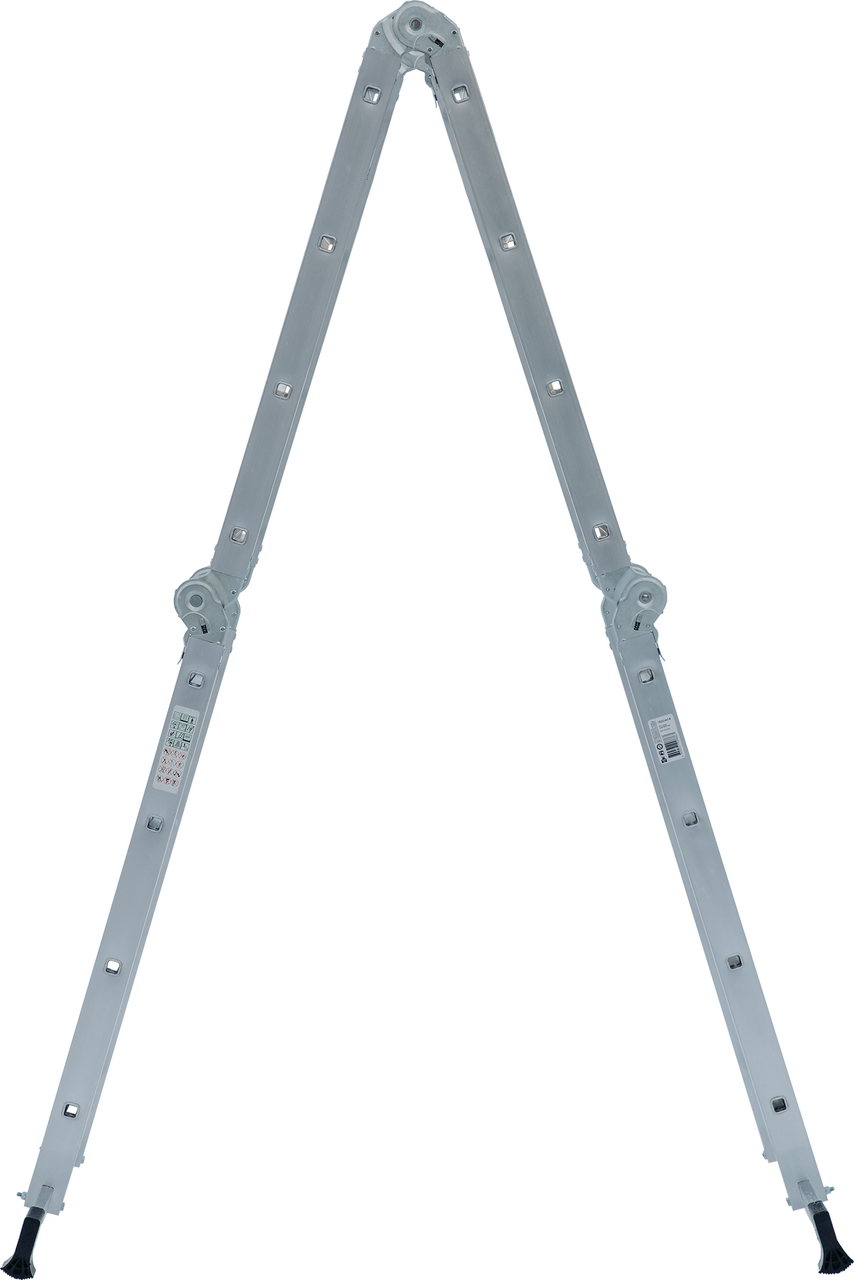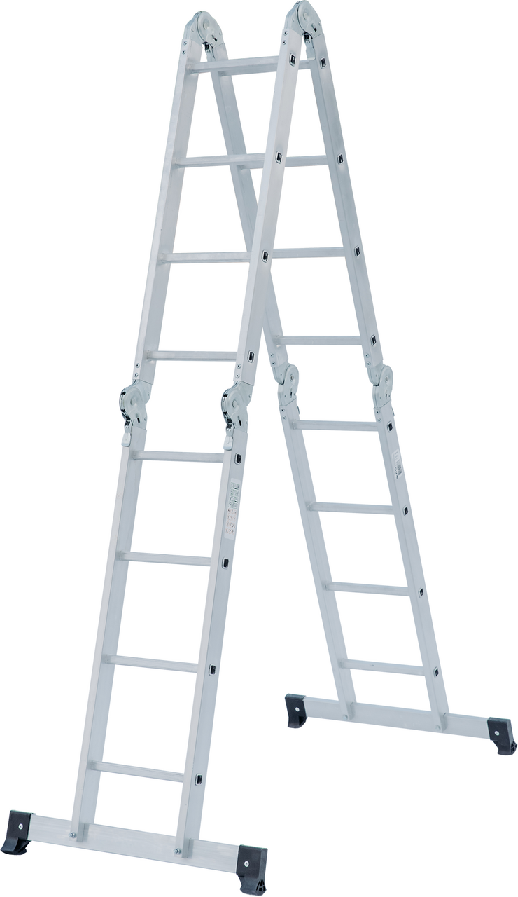 Многофункциональная лестница-трансформер для бытового применения. Изделие четыре в одном, варианты использования: приставная лестница, стремянка, приставная лестница с упором (согнутая Г-образная), помост. Легко устанавливается в рабочие положения благодаря шарнирным замкам, просто управиться одному человеку. Стойки и ступени из экструдированных алюминиевых профилей. Стойки дополнительно усилены в наиболее нагруженных местах. 32-кратная развальцовка в соединении ступеней со стойками обеспечивает высокую прочность и долговечность. Шарнирные замки с автоматической фиксацией можно регулировать одной рукой. Широкие поперечные траверсы обеспечивают высокую устойчивость во всех рабочих положениях. Опорные наконечники-башмаки траверсы из ударопрочного пластика, надежно закрепленные с помощью заклепок, для предотвращения скольжения. компактно складывается для хранения и транспортировки, в сложенном состоянии занимает мало места. Максимально допустимая нагрузка в положении Помост 100 кг.