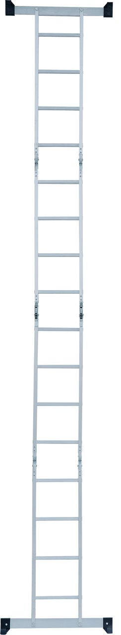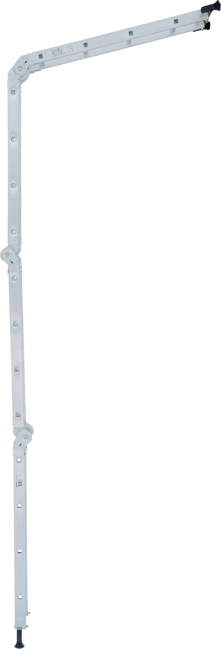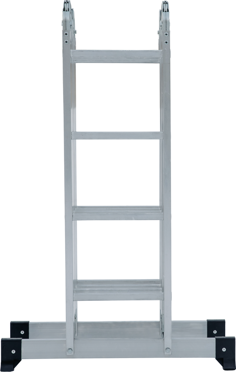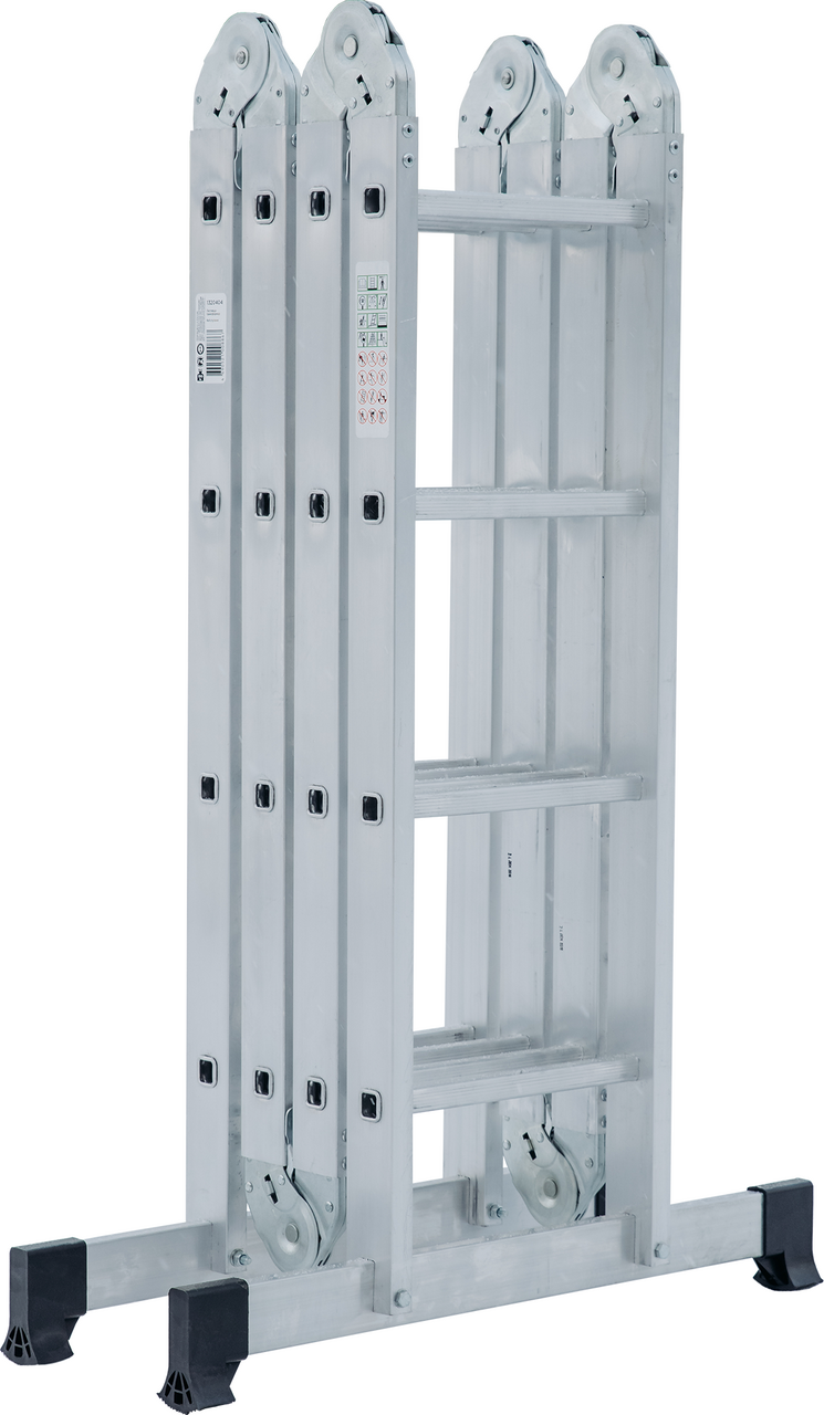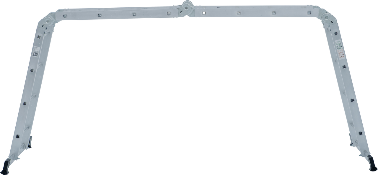 Многофункциональная лестница-трансформер для бытового применения. Изделие четыре в одном, варианты использования: приставная лестница, стремянка, приставная лестница с упором (согнутая Г-образная), помост. Легко устанавливается в рабочие положения благодаря шарнирным замкам, просто управиться одному человеку. Стойки и ступени из экструдированных алюминиевых профилей. Стойки дополнительно усилены в наиболее нагруженных местах. 32-кратная развальцовка в соединении ступеней со стойками обеспечивает высокую прочность и долговечность. Шарнирные замки с автоматической фиксацией можно регулировать одной рукой. Широкие поперечные траверсы обеспечивают высокую устойчивость во всех рабочих положениях. Опорные наконечники-башмаки траверсы из ударопрочного пластика, надежно закрепленные с помощью заклепок, для предотвращения скольжения. компактно складывается для хранения и транспортировки, в сложенном состоянии занимает мало места. Максимально допустимая нагрузка в положении Помост 100 кг.