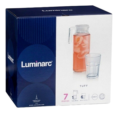 Набор питьевой Luminarc Tuff, 7 предметов отличается оригинальным, стильным дизайном, который хорошо впишется в любой интерьер помещения. Изделия выполнены из прочного стекла, характеризующиеся износостойкостью и надежностью. В случае неожиданного падения они разбиваются на большие куски с тупыми краями. Набор идеально подходит для ежедневного использования и оформления любого стола. В него входит кувшин объемом 1,3 л и шесть высоких стаканов. Крышка из пластика дает возможность оставлять в таре напитки на длительное время, не опасаясь при этом пыли и насекомых. Стекло не тускнеет и не впитывает неприятные запахи. Посуду можно мыть как вручную, так и в посудомоечной машине. Она выдерживает резкие перепады температур – от горячего компота до газированного напитка с кусочками льда. Комплект поставляется в прочной картонной коробке с ярким дизайном которая надежно сохраняет содержимое. Он может стать хорошим вариантом подарка для родных и близких на памятные даты и различные мероприятия.