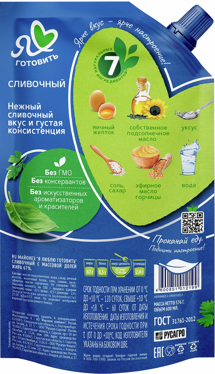 Майонез Я люблю готовить Московский провансаль Сливочный 67%, 600мл — это нежный и кремовый соус с добавлением сливок. Обладает густой консистенцией и нежным вкусом за счет натуральных сливок в составе и сниженного содержания уксуса. Данный продукт идеально подходит для приготовления закусок, канапе, салатов и вторых блюд. Не содержит ГМО.