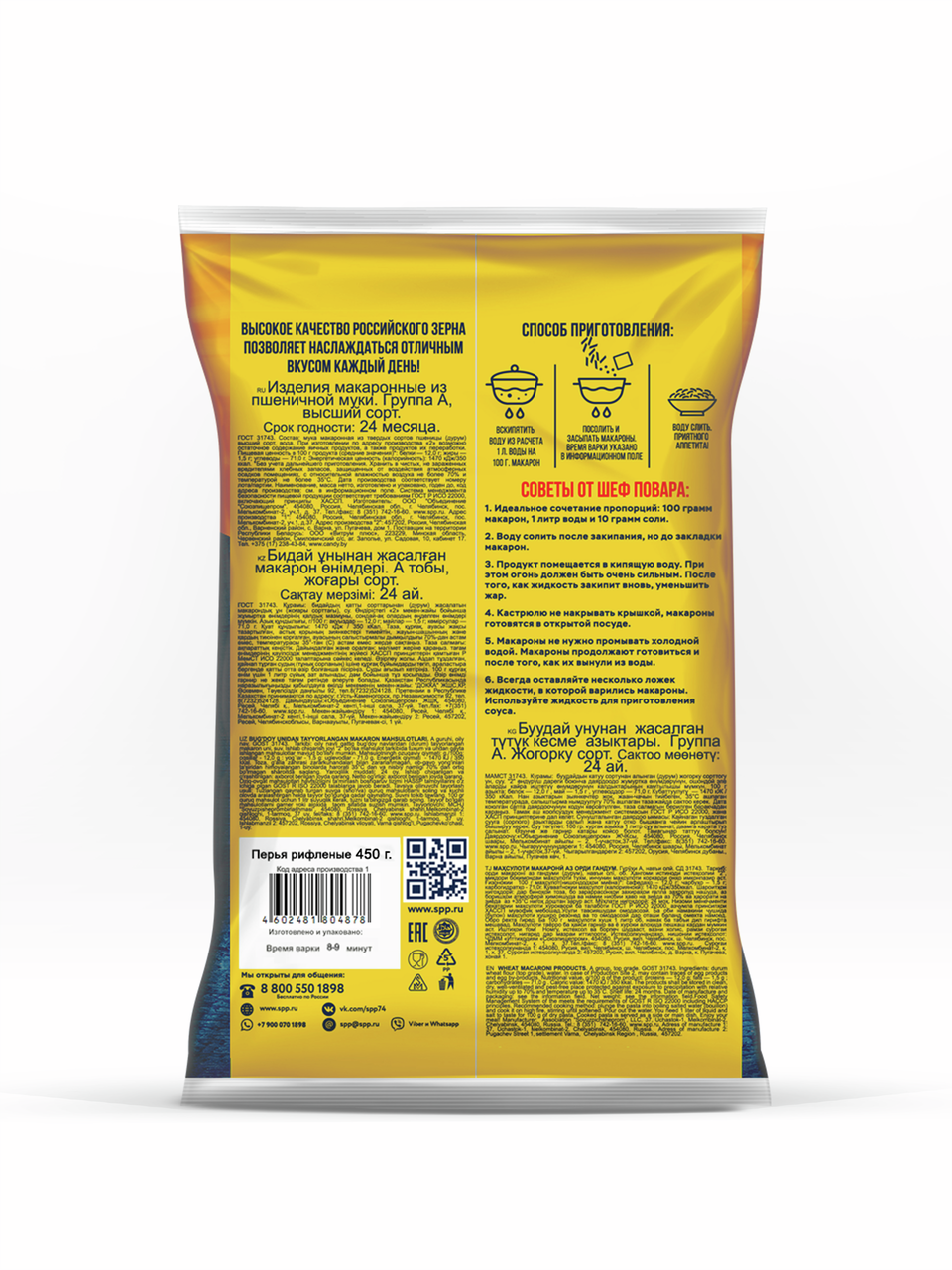 Макароны Царь перья рифленые группа А высший сорт, 450 г представляют собой трубочки среднего размера. Благодаря срезанным по диагонали краям они обладают удобной формой для приготовления итальянской пасты. Макароны подойдут для первых и вторых мясных блюд, закусок с овощами и сырами различных сортов. Их подают с острыми и сладкими соусами: грибным, томатным, овощным с базиликом или на основе сливок. Ребристость макаронных изделий позволяет полностью пропитаться сочным соусам. Особенно вкус пасты раскрывается в окружении изысканного зеленого горошка, прошутто и помидоров.