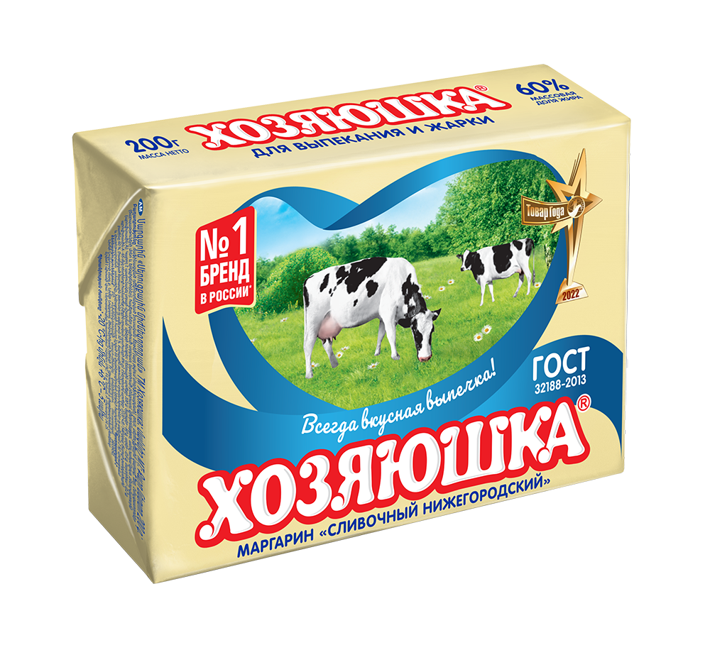 Маргарин Хозяюшка сливочный нижегородский, 200г прекрасно подойдет для создания нежного и объемного теста, для разогревания на сковороде, а также придания более сочного вкуса молочным кашам. Обладает легким сливочным вкусом и однородной консистенцией.