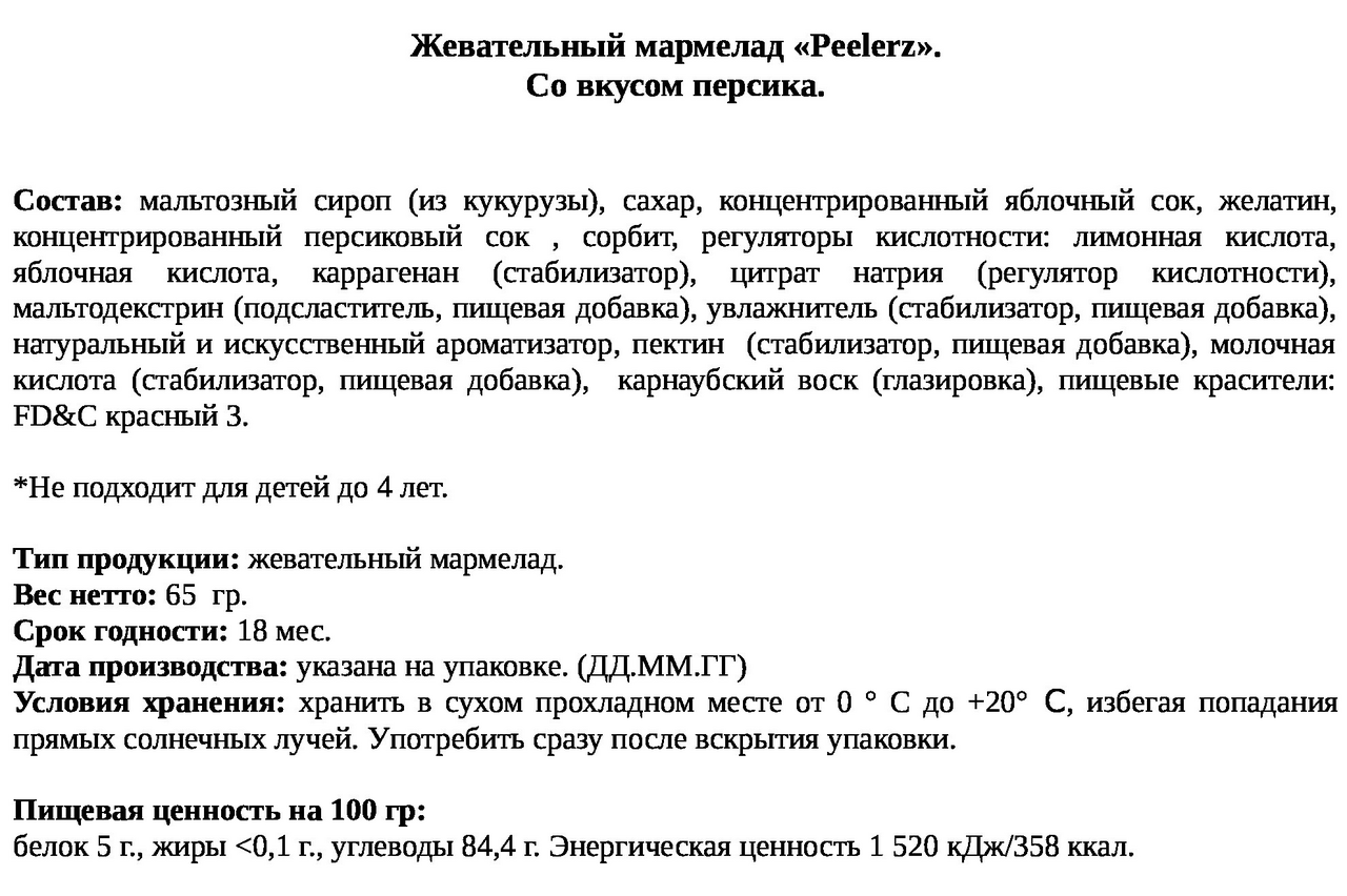 Жевательный мармелад Peelerz выполнен в виде персика. Необычность мармелада обусловлена тем, что фрукт содержится в кожуре, которую можно снять, при этом она является съедобной. Приготовлено на основе настоящего фруктового сока. Насладитесь подлинным вкусом фруктов, которые содержатся в наших мармеладах, благодаря мягкому, упругому внешнему слою и плотной сердцевине, обеспечивающей приятное послевкусие. Также отлично использовать мармелад, как перекус на работе, в школе и дома.