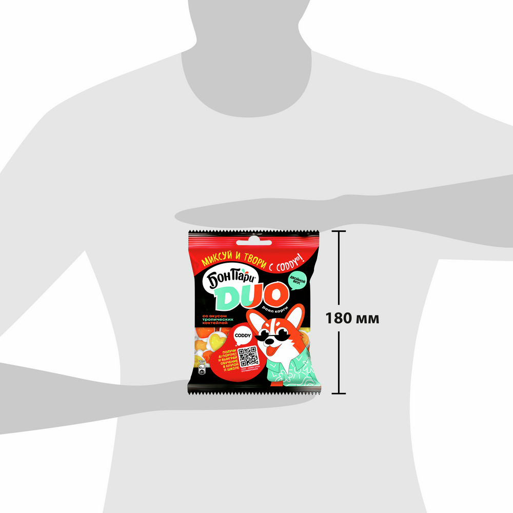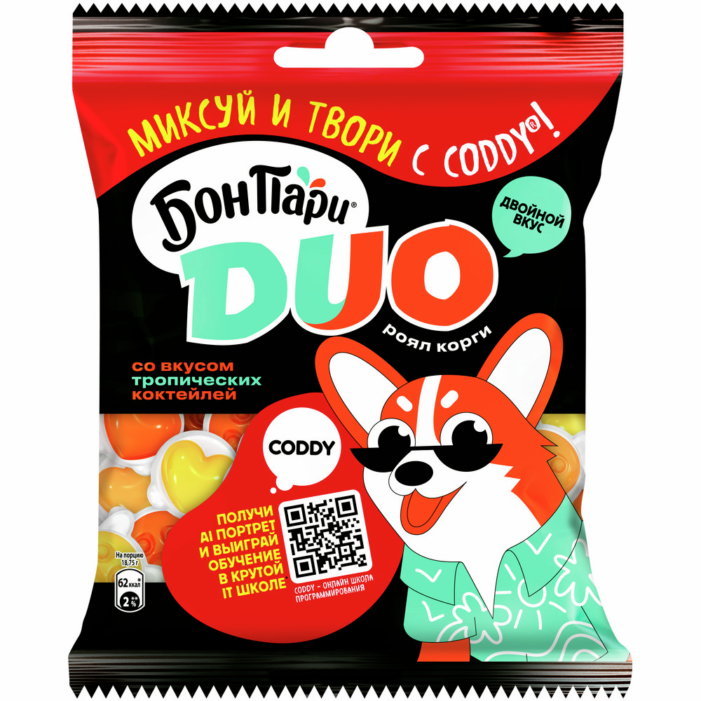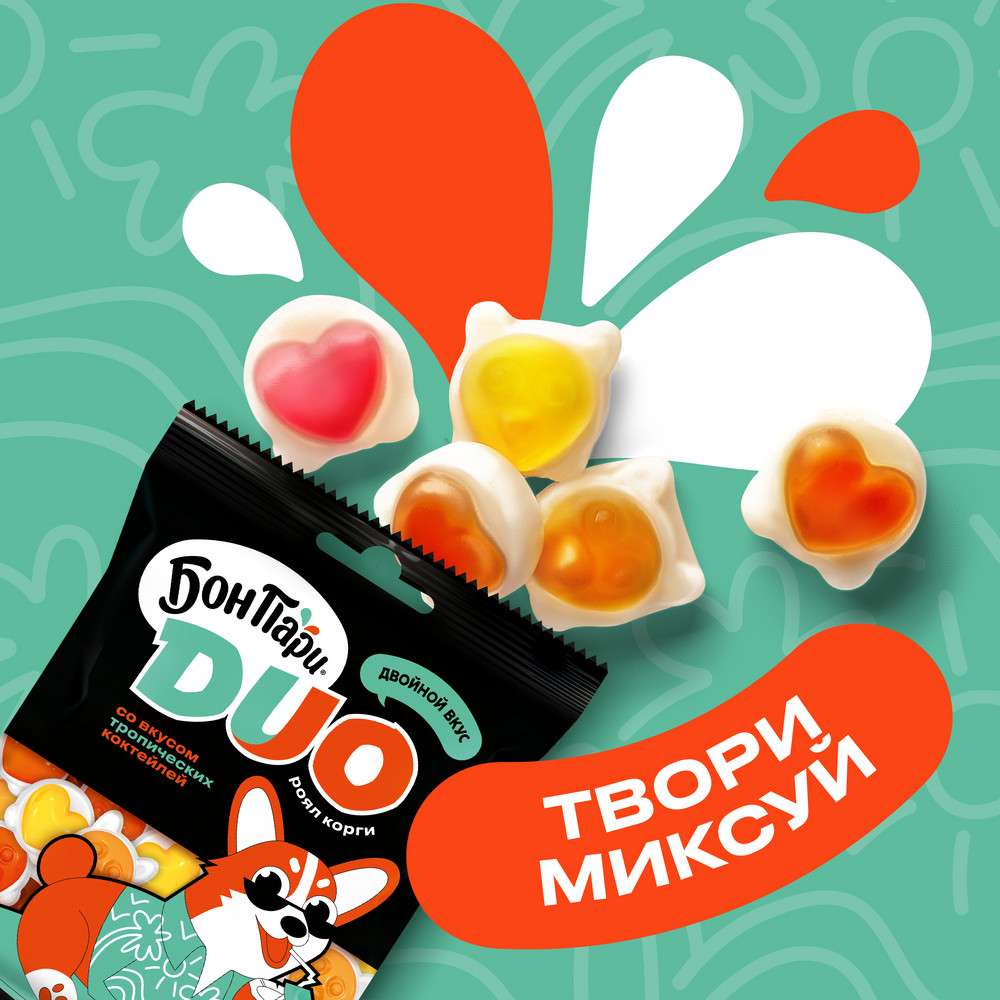 Жевательный мармелад Бон Пари Дуо в форме собачек корги. Мармелад Бон Пари Дуо для тех, в ком жив внутренний ребенок: сладкая жевательная провокация в форме смешных корги: обаятельные мордочки и сердечки со вкусом тропических коктейлей: манго-кокос, лимон-кокос, апельсин-кокос, клубника-кокос. Замиксуй по-королевски, соедини две мармеладные половинки и получишь тропическую собачку-вкусняшку. Упаковку удобно взять с собой или разделить с друзьями. Cледите за рекомендуемой порцией сладкого. Одна порция: две дуо-мармеладки. Мармелад производится без добавления искусственных красителей. В производстве используется концентрированный фруктовый сок. Необычное сочетание кислого и сладкого. Без искусственных красителей.