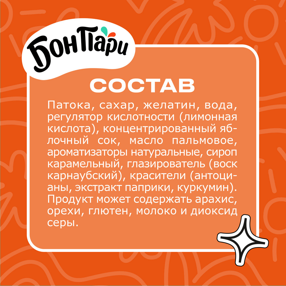 Патока, сахар, желатин, вода, регулятор кислотности (лимонная кислота), концентрированный яблочный сок, масло пальмовое, ароматизаторы натуральные, сироп карамельный, глазирователь (воск карнаубский), красители (антоцианы, экстракт паприки, куркумин).