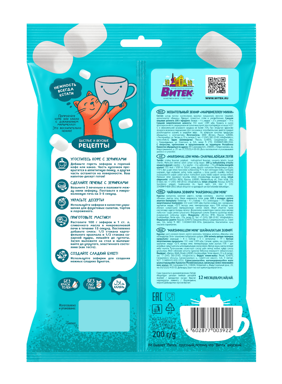 Сахар, патока крахмальная, глюкоза, желатин пищевой, влагоудерживающий агент - сорбитовый сироп, ароматизатор Ванилин. Не содержит глютена, жиров. Продукт может содержать следы яичного белка. продукт имеет сертификат Халяль.
