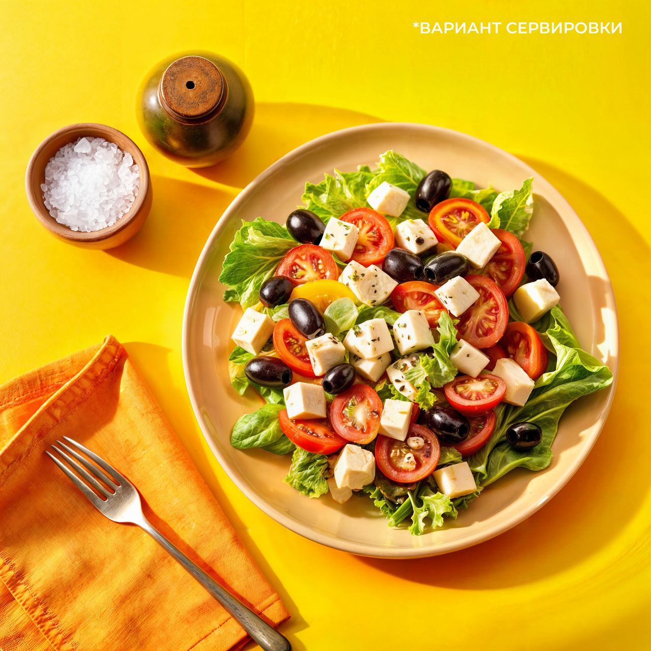 Вода, маслины сорта Охибланка, паста из сыра Фета (вода, микс из сыра Фета (пастеризованное молоко, сычужный фермент, мезофильный молокосвертывающий фермент микробного происхождения, натуральный ароматизатор сыр Фета, стабилизатор Е401, усилители вкуса и аромата Е621, Е631, Е627)), соль, усилители вкуса и аромата (Е621, Е631, Е627), регулятор кислотности молочная кислота, фиксатор окраски: глюконат железа.