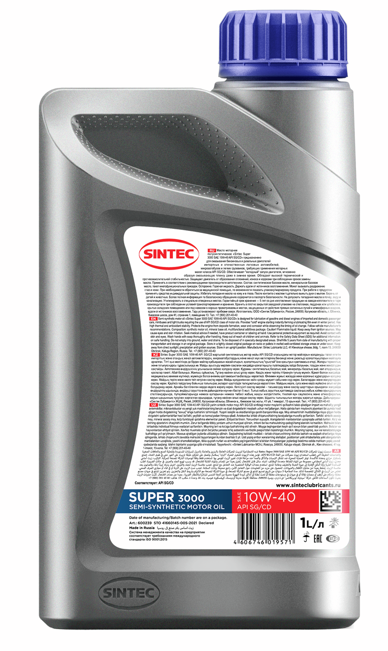 Полусинтетическое моторное масло Sintec Super 3000 10W-40 SG/CD произведено из высококачественных базовых масел и эффективного сбалансированного пакета присадок. Предназначено для использования в бензиновых и дизельных двигателях автомобилей отечественного и зарубежного производства. Демонстрирует стабильные характеристики в течение всего периода использования. Обеспечивает сниженный расход на угар и высокие антикоррозионные свойства.