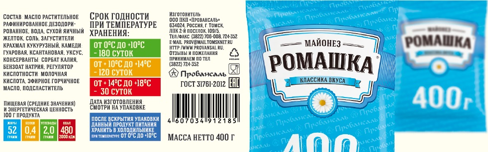 Майонез Провансаль Ромашка 52%, 400г – универсальная заправка для салатов и закусок. Натуральный продукт для всей семьи отлично подойдет к готовым блюдам придаст изысканный вкус.