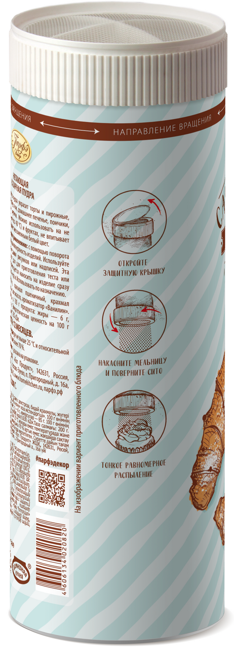 Сахарная пудра для декорирования тортов, пирожных булочек, печенья, пончиков, кексов, куличей, десертов и других кондитерских изделий. Ее достоинство состоит в том, что ее можно использовать на еще не остывших изделиях (до 40' C), не впитывает влагу и жир, сохраняет неизменным белый цвет.