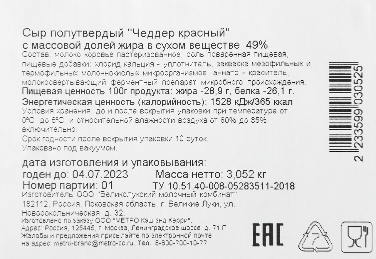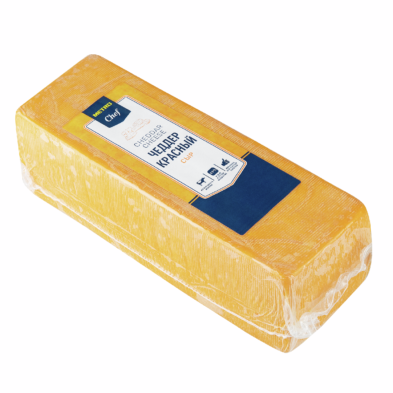 Сыр Metro Chef Чеддар 50%, красный, бзмж, изготовлен из коровьего молока без добавок и ГМО. Продукт характеризуется острым вкусом с резковатой кислинкой, гладкой и плотной текстурой, сливочным цветом с желтоватым оттенком. В состав полутвердого сорта сыра входят пастеризованное молоко, соль, бактериальная закваска молочнокислых микроорганизмов, безопасные красители. Польза чеддера обусловлена богатым составом минералов и витаминов группы В. Регулярное употребление сыра нормализует обмен веществ в организме. Продукт используется в кулинарии в качестве закуски, в сочетании с алкоголем, некоторыми блюдами: омлетами, бисквитами, мясной нарезкой. Чеддер хорошо дополняет вкус мяса, рыбы и овощей, входит в состав некоторых соусов. Его используют как основной ингредиент для гренок, канапе. Сырная нарезка поставляется в пластиковом контейнере, удобном для переноски и хранения, чтобы исключить его высыхание.