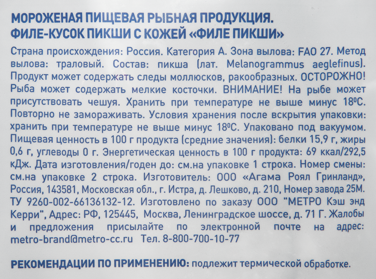 METRO Chef Филе-кусок пикши с кожей свежемороженый, 400г позволяет приготовить легкие диетические блюда для всей семьи. Оно уже подготовлено для создания кулинарных шедевров, что экономит время хозяйки и позволяет добиться идеального результата. Пикша - крупная рыба семейства тресковых. Ее вылавливают в северных морях и сразу разделывают. Полученное филе с кожей подвергают шоковой заморозке, что сохраняет структуру, сочность и полезные свойства рыбы. Продукт используют для создания летней ухи, фарша для котлет или тефтелей, запекания с овощной подушкой, приготовления в кляре, на гриле и на пару. Нежное мясо рыбы богато белком, аминокислотами, витаминами С, PP, фосфором, фтором и калием. Продукт благотворно влияет на сердечно-сосудистую систему и органы кроветворения, укрепляет костную ткань. Его следует хранить при температуре не выше -18С и размораживать постепенно, в обычной камере холодильника или в воде комнатной температуры. Это сохранит структуру мякоти и позволит насладиться натуральным вкусом.