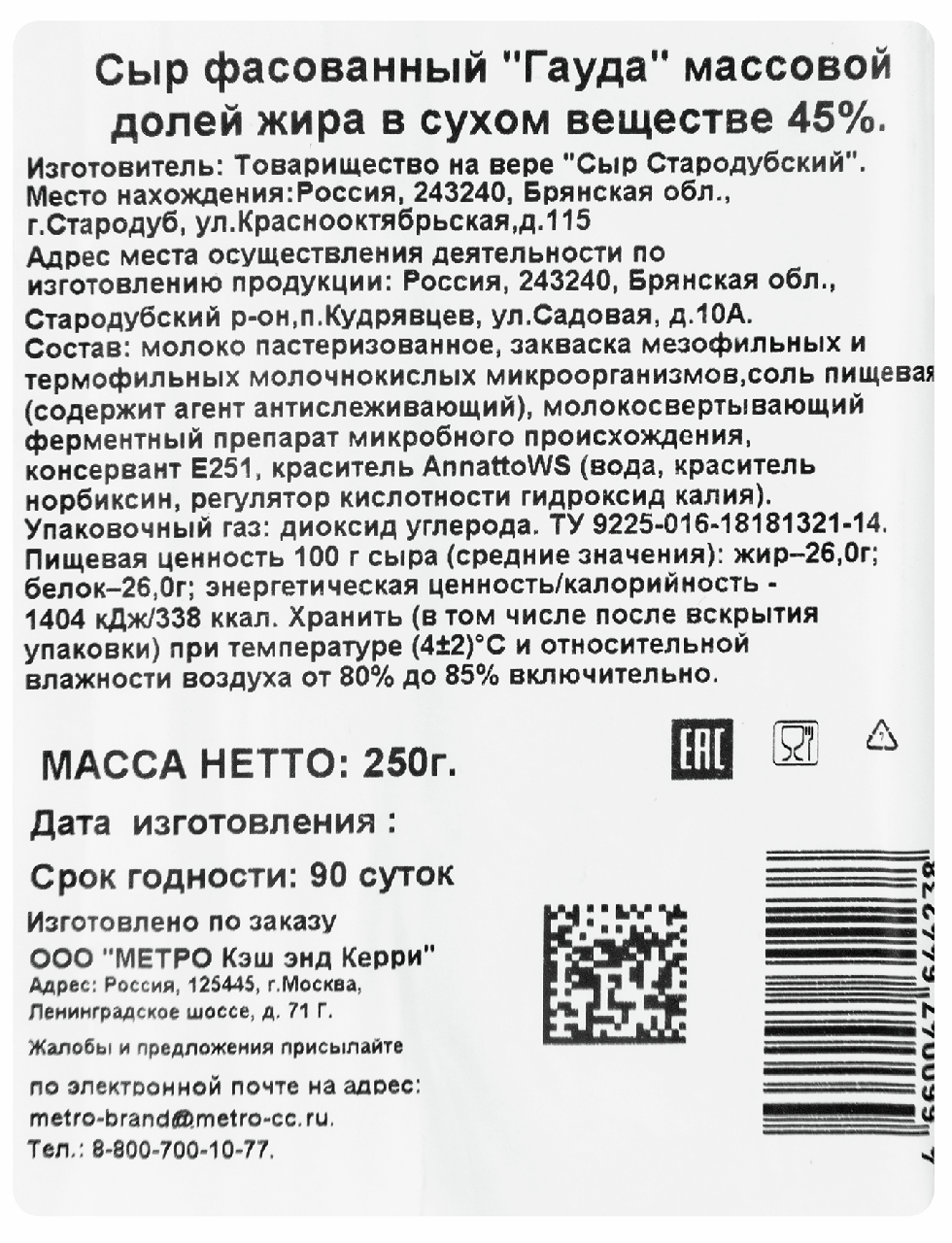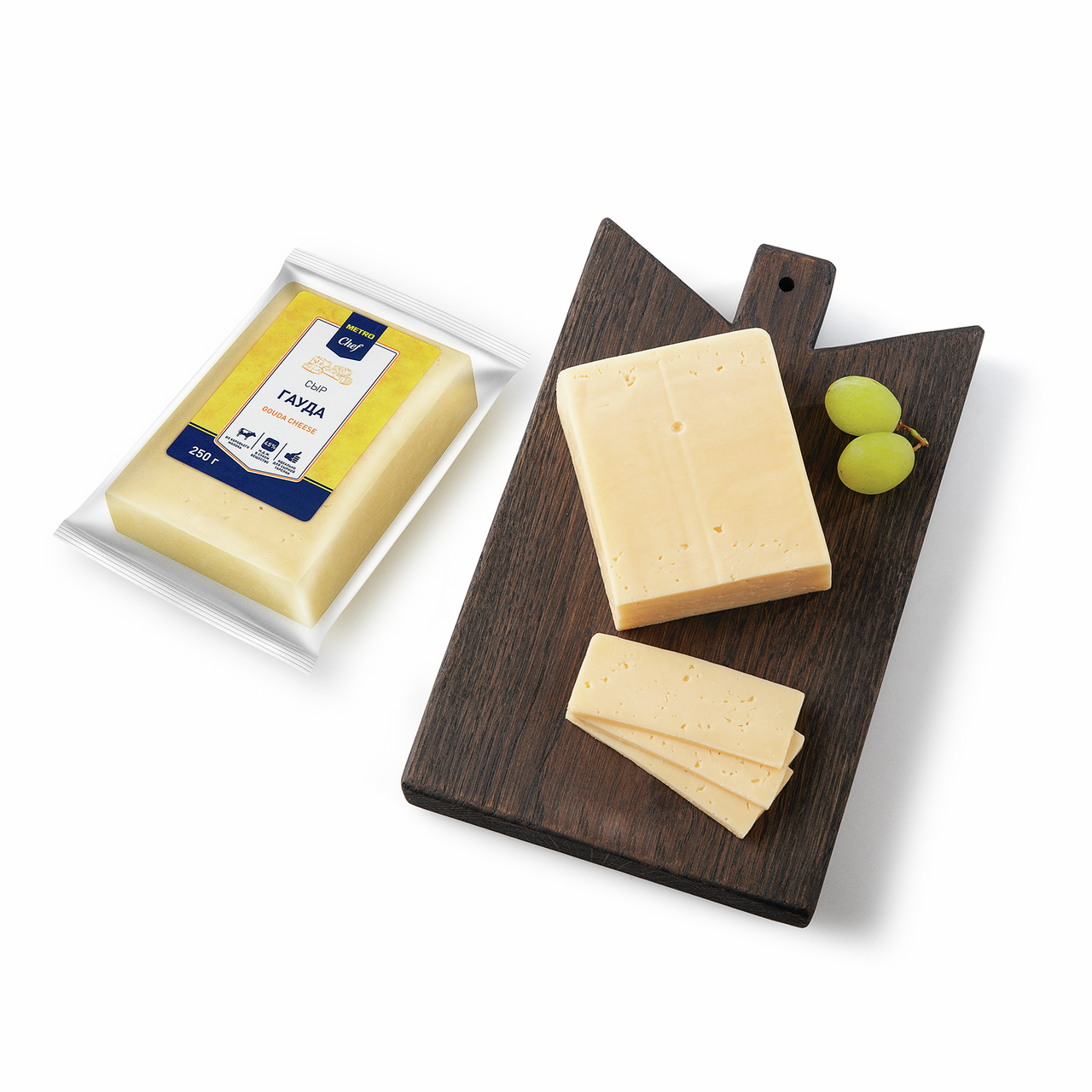 Полутвёрдый сыр, взявший своё название по голландскому городу Гауда. Имеет лёгкий кремово-сливочный вкус, благодаря которому довольно универсален в употреблении. Гауда традиционно входит в состав сырных тарелок, отлично сочетается с фруктами, тостами, винами. Гауду также можно добавлять в салаты, горячие блюда, например, запеканки.