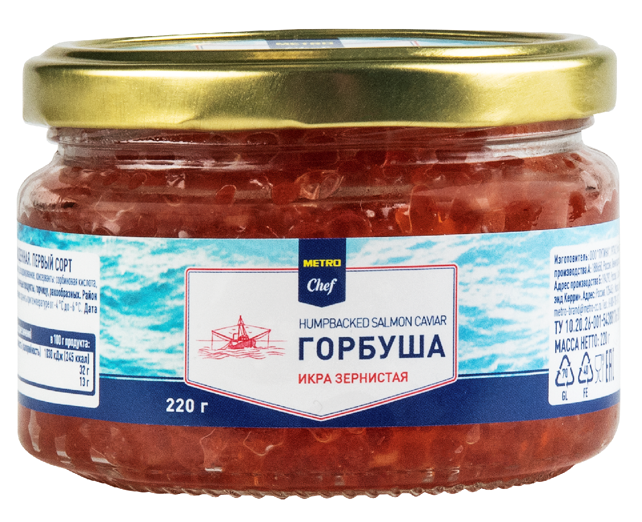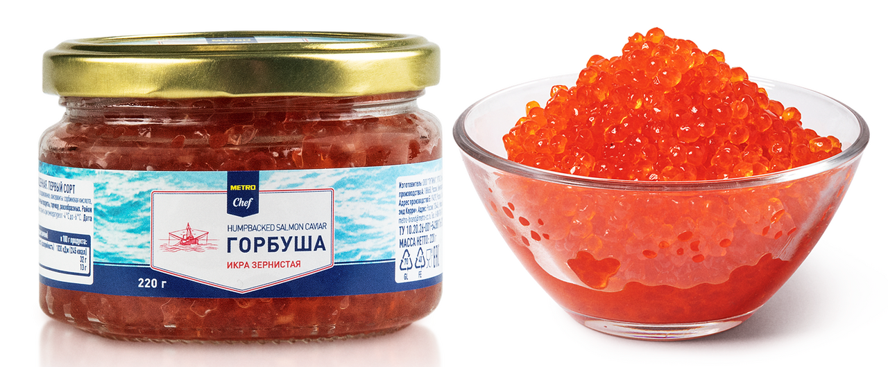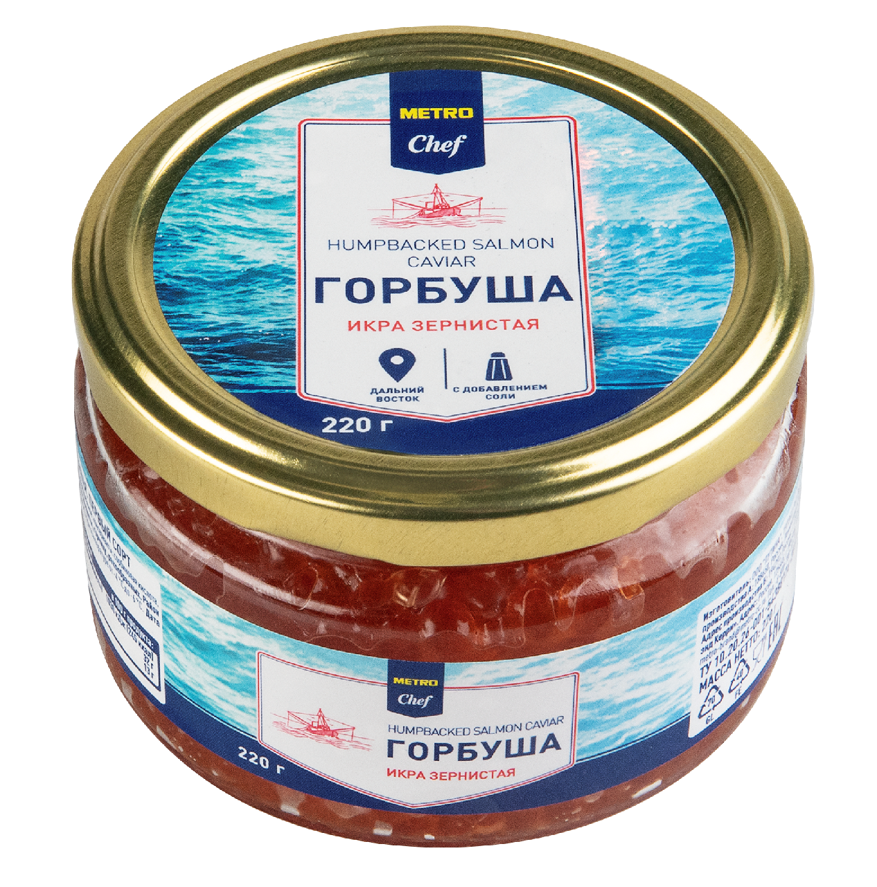 METRO Chef Икра горбуши лососевая 220г получена из рыб, которые проходят нерест в реках Дальнего востока. Производитель собирает сырье только у здоровых особей и подвергает его слабому солению. Чистые, однородные, упругие икринки в тонкой оболочке обладают приятным насыщенным цветом, деликатным ароматом, классическим вкусом со слабым привкусом горечи и остроты. Икра горбуши послужит для создания деликатесных бутербродов и тарталеток. Лакомство также можно добавлять в салаты, роллы, использовать для приготовления банкетных и праздничных блюд. Лососевая икра – источник легкоусвояемого белка, аминокислот, омега, широкого спектра витаминов и минералов. Деликатес легко усваивается, стимулирует мозговую деятельность, повышает стрессоустойчивость, улучшает состояние кожи, ногтей и волос.