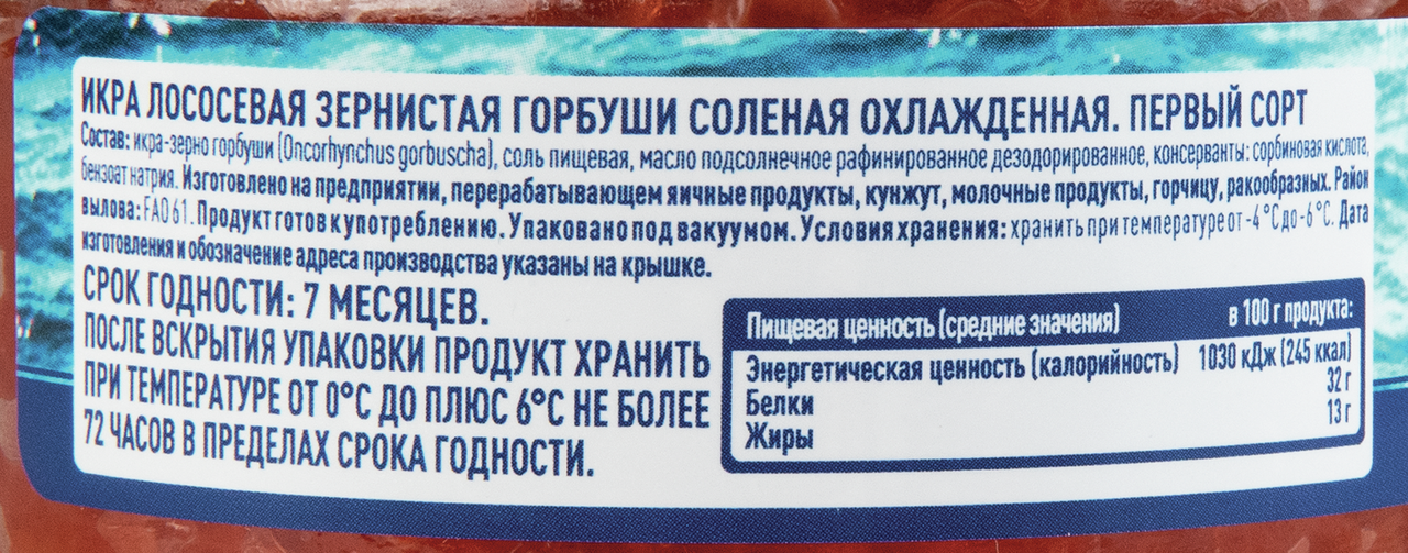 Икра-зерно горбуши (Oncorhynchus gorbuscha), соль пищевая, масло подсолнечное рафинированное, консерванты: сорбиновая кислота, бензоат натрия.