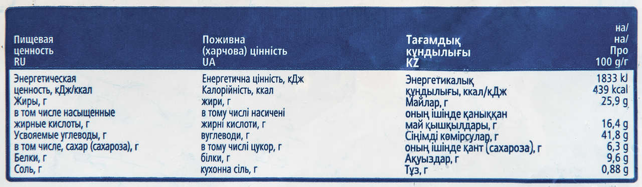 Мука пшеничная в/с, вода, масло 18%, сахар, дрожжи, эмульгатор Е472е, ароматизатор, аскорбиновая кислота, краситель Е161b, энзимы. Может содержать соевый лецитин и орехи.