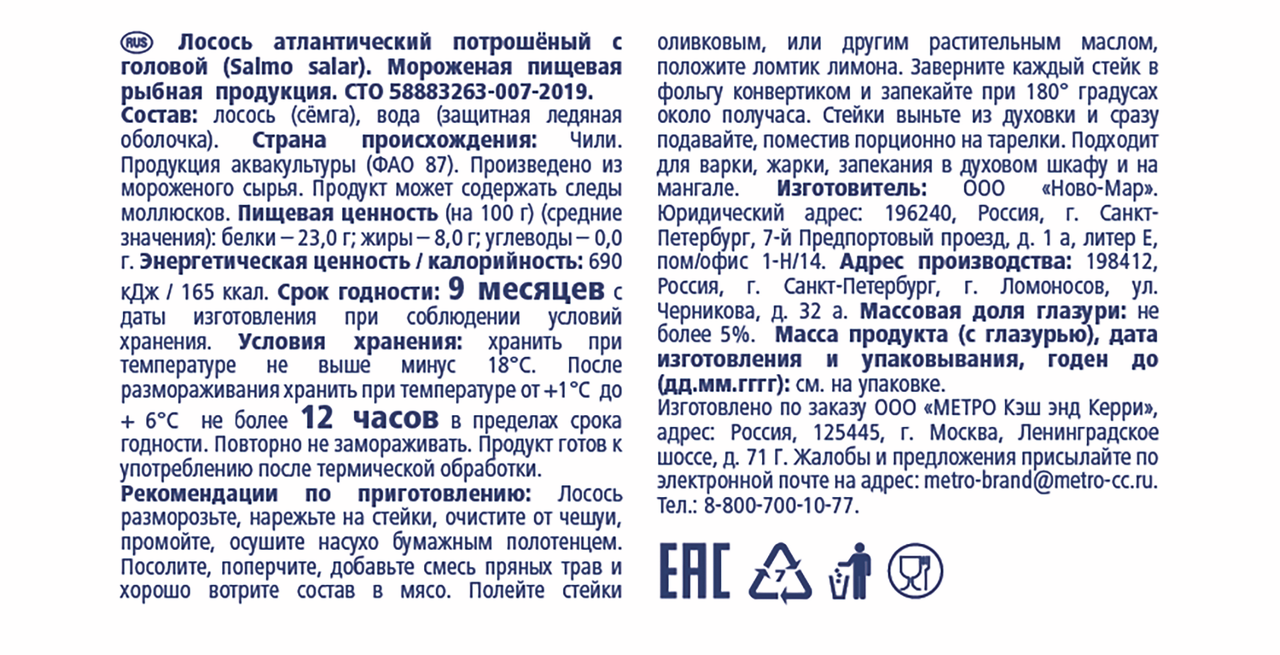 METRO Chef Лосось потрошеный с головой свежемороженый, ~5-6кг