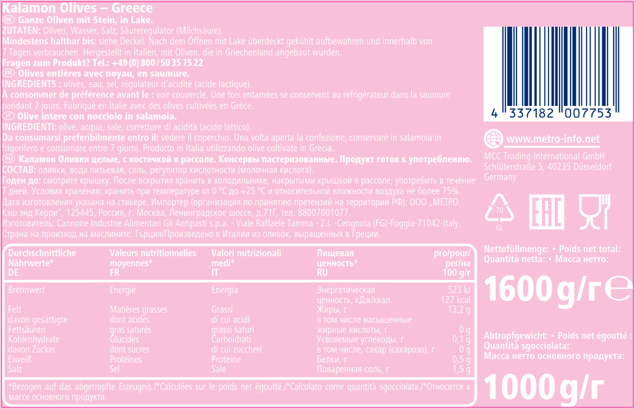 METRO Chef Маслины Каламон с косточкой, 1.7л станут хорошим дополнением к привычному рациону, а также достойным сопровождением к блюдам, поданным на праздничный стол. Продукт с пикантным солоноватым вкусом удачно оттенит дегустационные характеристики мяса или рыбы, подойдет к сырам и колбасам. Его можно предлагать как самостоятельную закуску, а также использовать в кулинарных целях: при приготовлении оригинальных канапе, солянок, похлебок и других первых блюд, пасты, пиццы, применять в виде одного из ингредиентов салата.