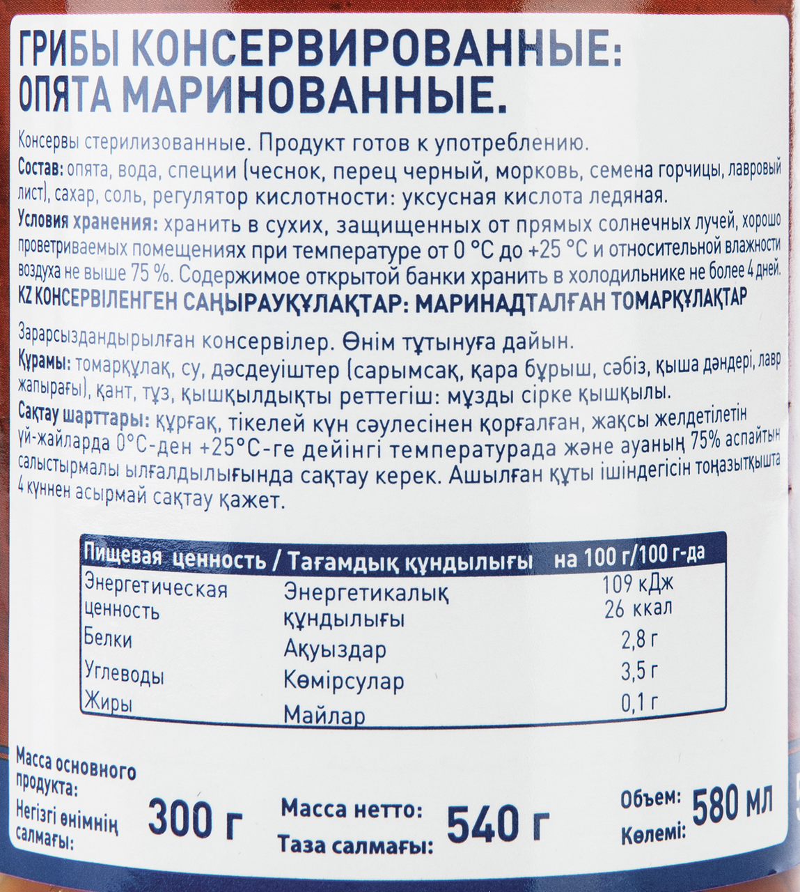 Опята, вода, специи (чеснок, перец черный, морковь, семена горчицы, лавровый лист); сахар, соль, регулятор кислотности: уксусная кислота ледяная.
