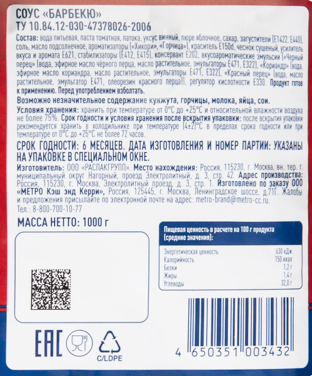 Вода питьевая, паста томатная, патока, уксус винный, пюре яблочное, сахар, загустители (Е1422, Е440), соль, масло подсолнечное, ароматизаторы (Хикори, Горчица), краситель Е150d, чеснок сушеный, усилитель вкуса и аромата Е621, стабилизаторы (Е412, Е415), консервант Е202, вкусоароматические эмульсии: черный перец (вода, эфирное масло чёрного перца, масло растительное, эмульгаторы Е471, Е322), кориандр (вода, эфирное масло кориандра, масло растительное, эмульгаторы Е471, Е322), красный перец (вода, масло растительное, эмульгатор Е471, олеорезин красного перца), регулятор кислотности Е330.