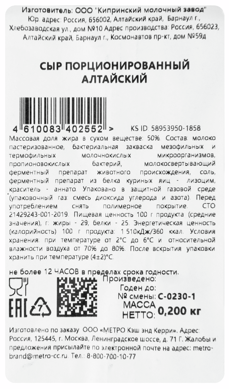 Производится из пастеризованного молока и относится к выдержанным сортам. У него однородная плотная консистенция без глазков; вкус сливочный, с пикантными сладковатыми нотками, которые достигаются благодаря длительной выдержке. Алтайский сыр подходит для приготовления бутербродов и закусок, а также составления сырной тарелки. Продукт не содержит сухого молока, растительных жиров, искусственных добавок и консервантов. Обладает изысканным терпким вкусом и твердой текстурой с редкими круглыми или овальными глазками.