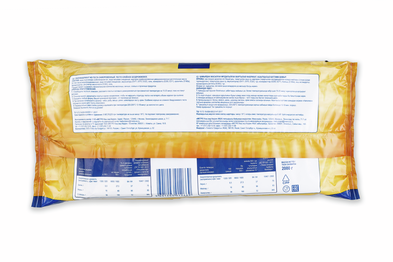 Тесто слоеное METRO Chef дрожжевое быстрозамороженное, 2 кг — полуфабрикат, предназначенный для быстрого приготовления ватрушек, пирогов, печенья, булочек и других десертов, в которые могут входить как сладкие, так и несладкие начинки. В упаковке содержится четыре тонких пласта общей массой 2 кг, что позволяет за минимальный срок сделать большое количество выпечки. Пласты сначала размораживают до мягкости при комнатной температуре и затем раскатывают, присыпая мукой и двигая скалкой в одном направлении. Это позволяет не испортить структуру теста, необходимую для получения пышных, поднявшихся десертов. Подготовленный таким образом полуфабрикат нарезают в любой форме, при желании добавляя наполнитель, и запекают в предварительно разогретой духовке при температуре около 220С на протяжении 13-18 минут.
