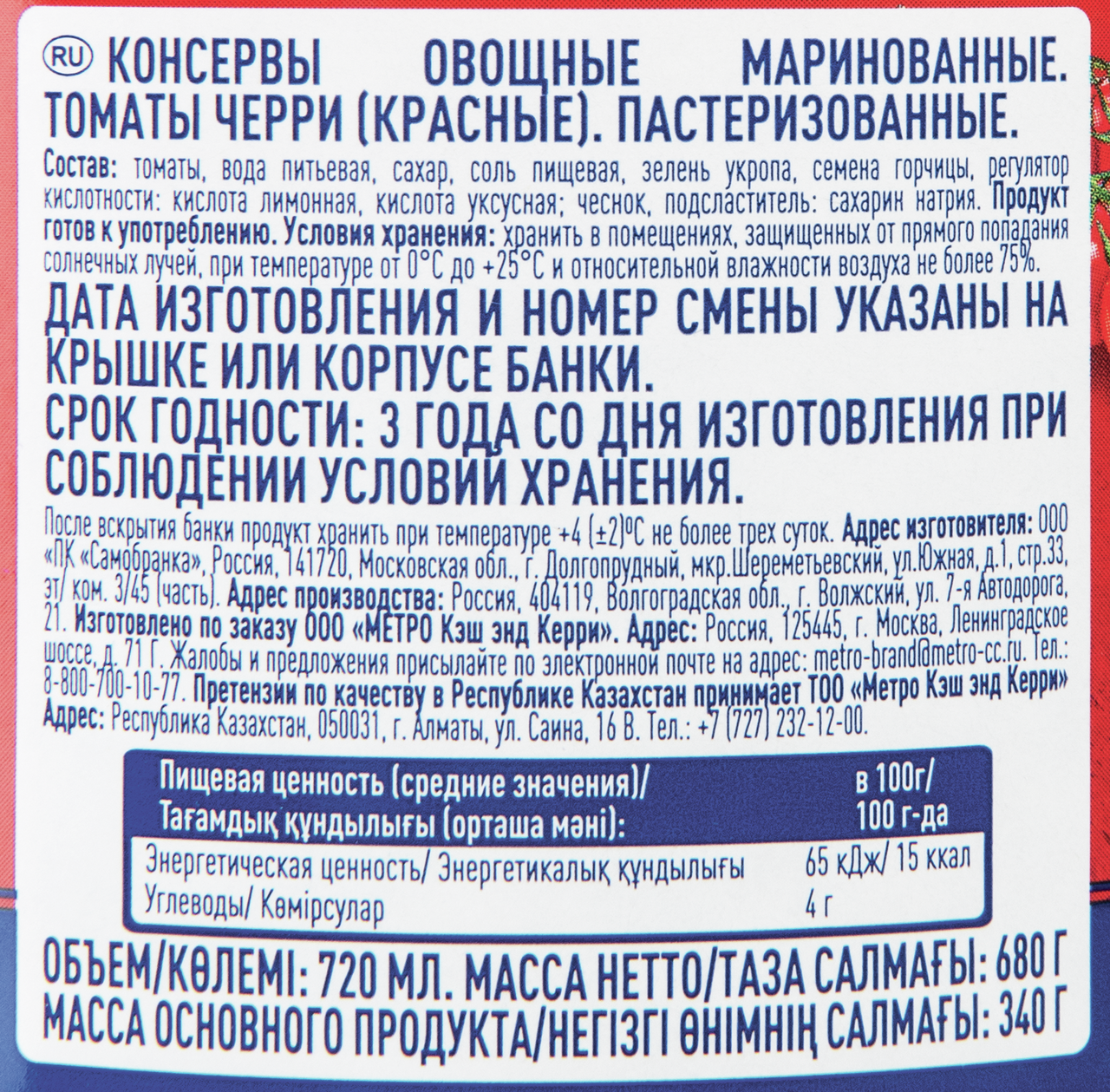 Томаты черри, маринад (вода питьевая, сахар, соль, регулятор кислотности – лимонная кислота), зелень, чеснок, специи (в т.ч. семена горчицы).